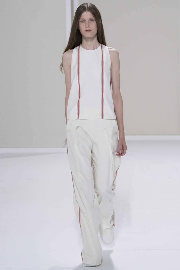 Spring had more of an edge, even if it was the edge of a silver spoon. The show began and ended with sharp, spare silhouettes, mostly stripped of adornment to let the fabric quality bask in purity of form. A group of midnight blue/black double-faced cashmere, cotton and silk blend, was cut into minimal separates with a smart, top-of-the-corporate-ladder polish. A long waistcoat and matching pants were worn over a white and navy swimsuit with a V-shaped strap down the center that made all the difference between plain and subtle style. The closing looks were equally clean but more casual in off-white double-faced linen cotton and silk that had a dense parchment look on a pert tennis shift and a long, racer-back tank dress worn with white sneakers.