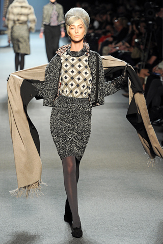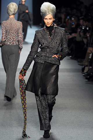Jean Paul Gaultier, for his ready-to-wear fall collection 2011 worked with the traditional codes of upper class, thick tweeds, tailored trousers and ribbed cardigans. The models came dressed as matrons in gray beehives and tame kitten heels with just about everything in between covered up. Silk blouses, colorfully printed or plain, were buttoned all the way and some topped with a scarf.