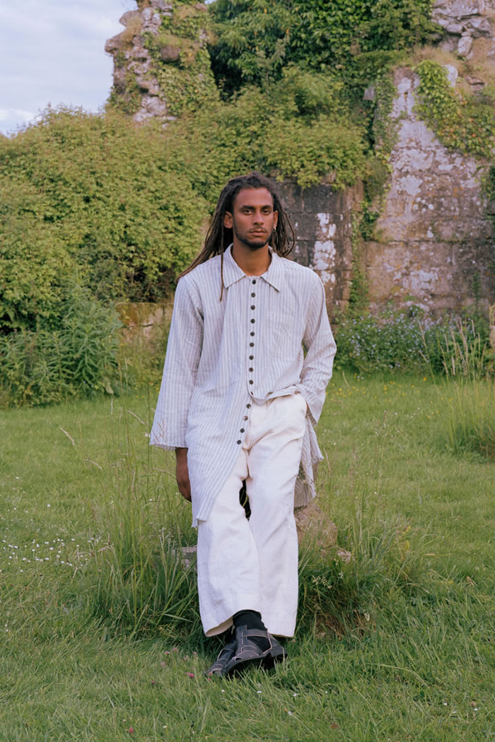 For the new collection, due to the pandemic forcing markets where he sourced antique linen to shut, he instead developed hemp-linen mixed and hemp-cotton mixed cloth with several Irish mills. Skelton said by mixing two different natural fibers together, the fabric becomes structured and multi-tonal even when dyed with just one color.