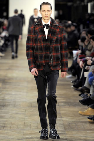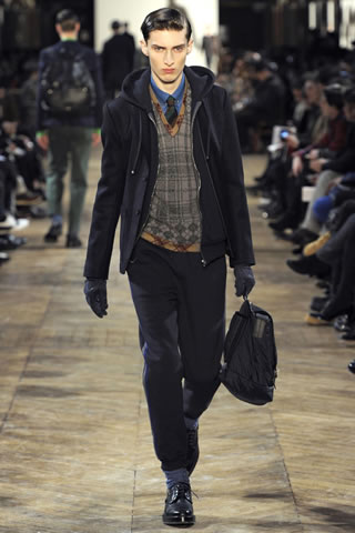 Kenzo Fall/Winter 2011 Men’s Collection was again successful in establishing a character through menswear desgins presented on Paris fashion week 2011. Kenzo’s men collection got a flavour of Christie thriller. Bowler-hatted model wearing shawl-collared jacket with high-waisted pleated pants reminded of 1940. The confident model aristo in a vermilion velvet jacket over a blue shirt, green sweater, and burgundy cords was full of attractive colors during men’s Paris fashion week 2011. Kenzo fall winter collection of menswear is trendy for 2011 fashion.