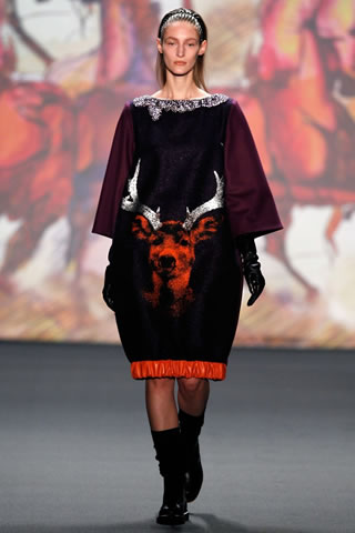 Quirky intarsia and embroidered motifs on dresses and the backs of jackets included an antlered stag, and a tiger wearing a fedora. Despite his animal instincts, Kerner might do well to follow the scent of his own more staid second line, Senses, which is featured at House of Fraser.