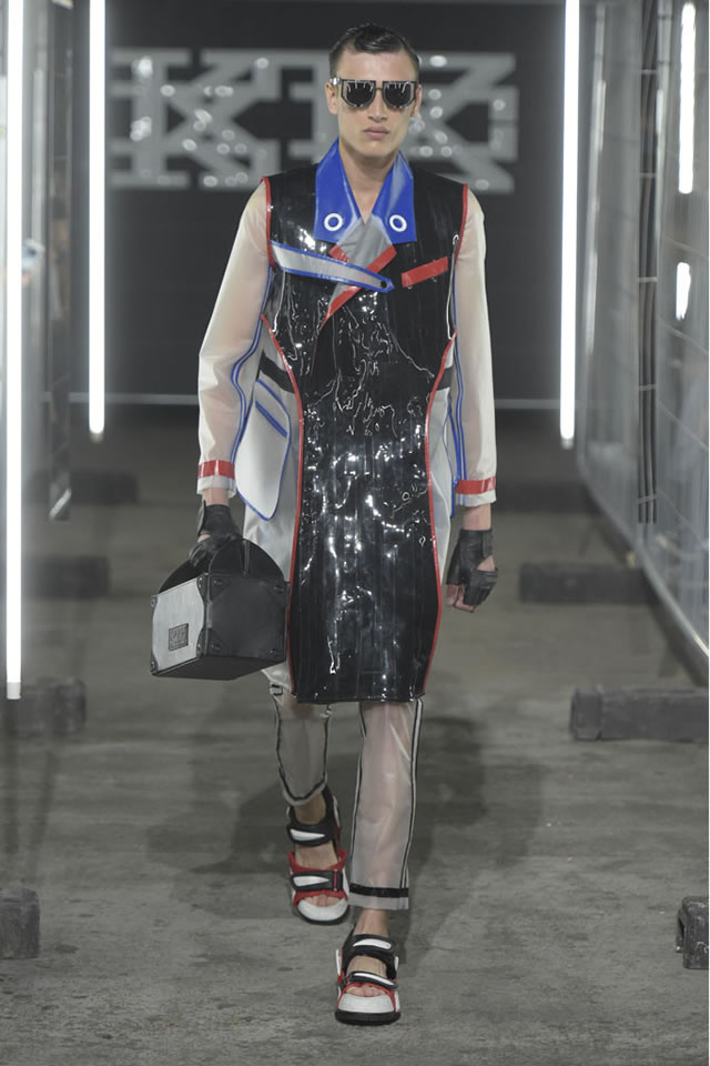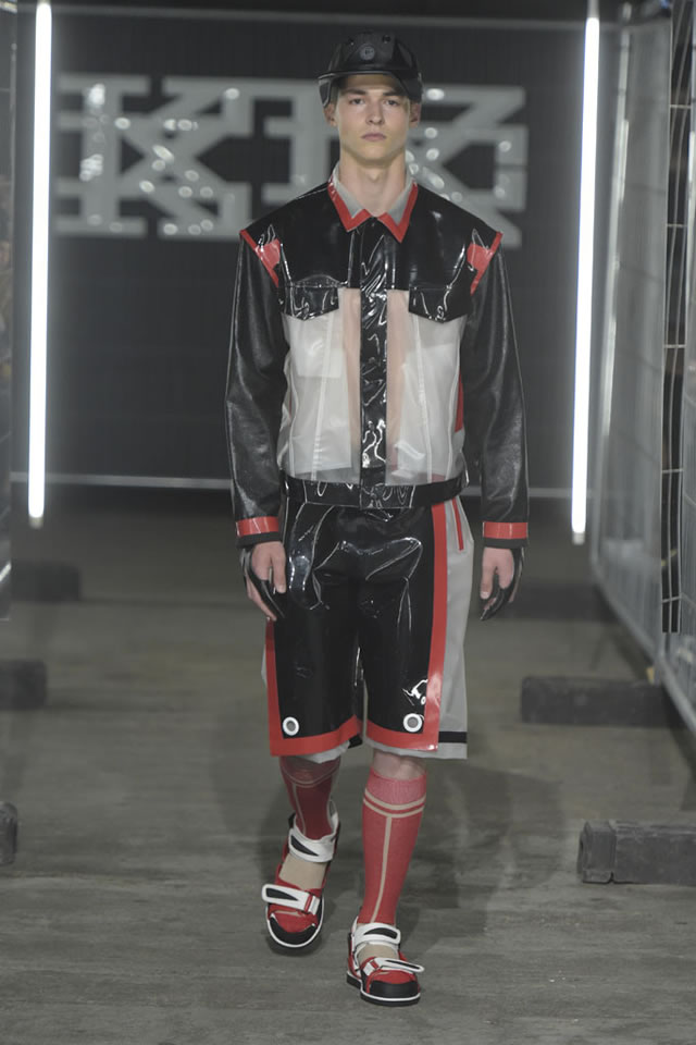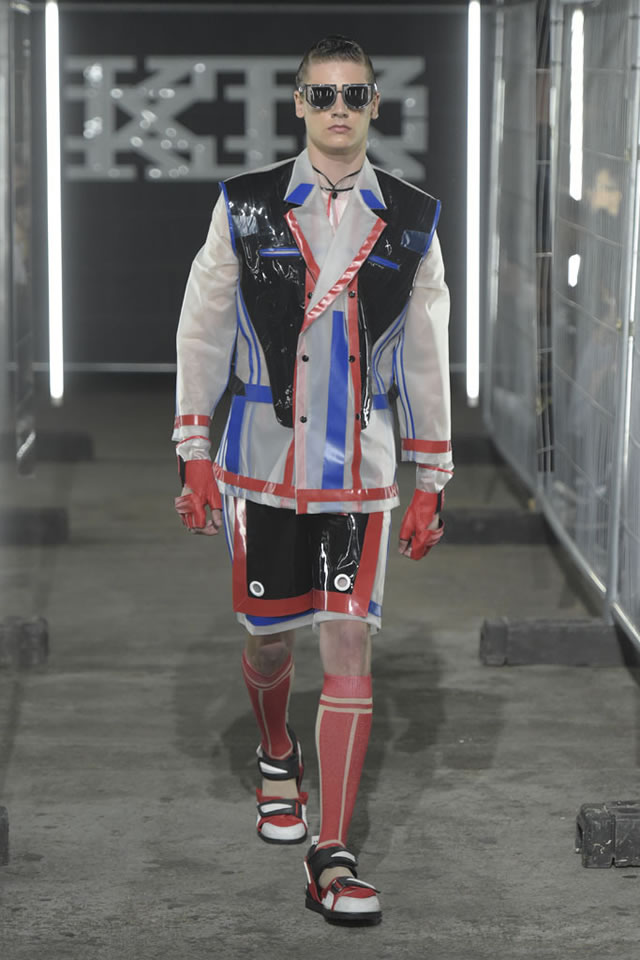 Pejoski said in his show notes that he’d wanted to work with “unusual industrial materials,” among them paper, rubber, aluminum and electrical tape, and the clothes looked more like objects that had been soldered together in a workshop than cut from material. One trenchcoat was made of panels of translucent white plastic and shiny black PVC, with seams in bright red and royal blue, while an oversize bomber was done in silver foil with net patches, and paired with matching shorts. Pejoski complemented the looks with thick-soled walking sandals in shades of red, blue and bright white, which added to the comic-book mood.