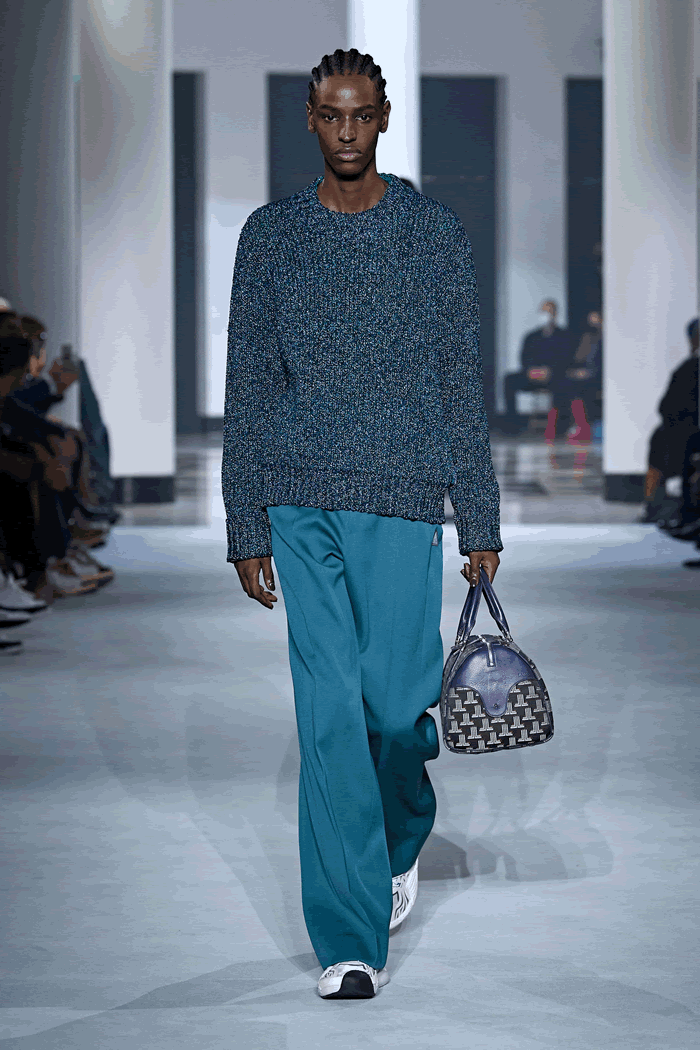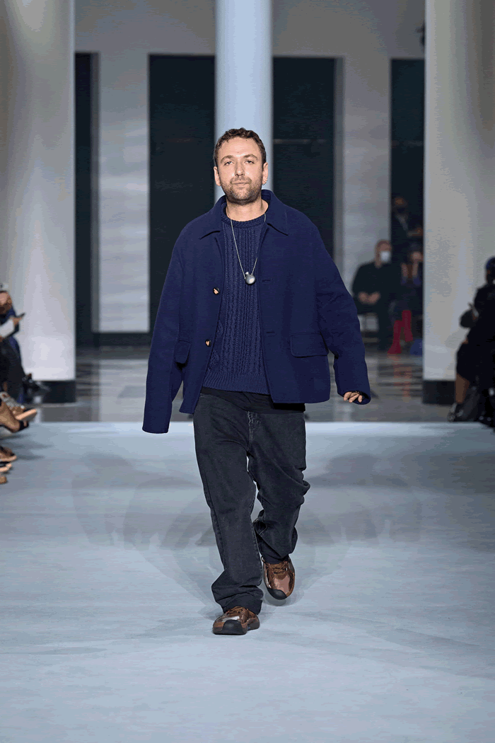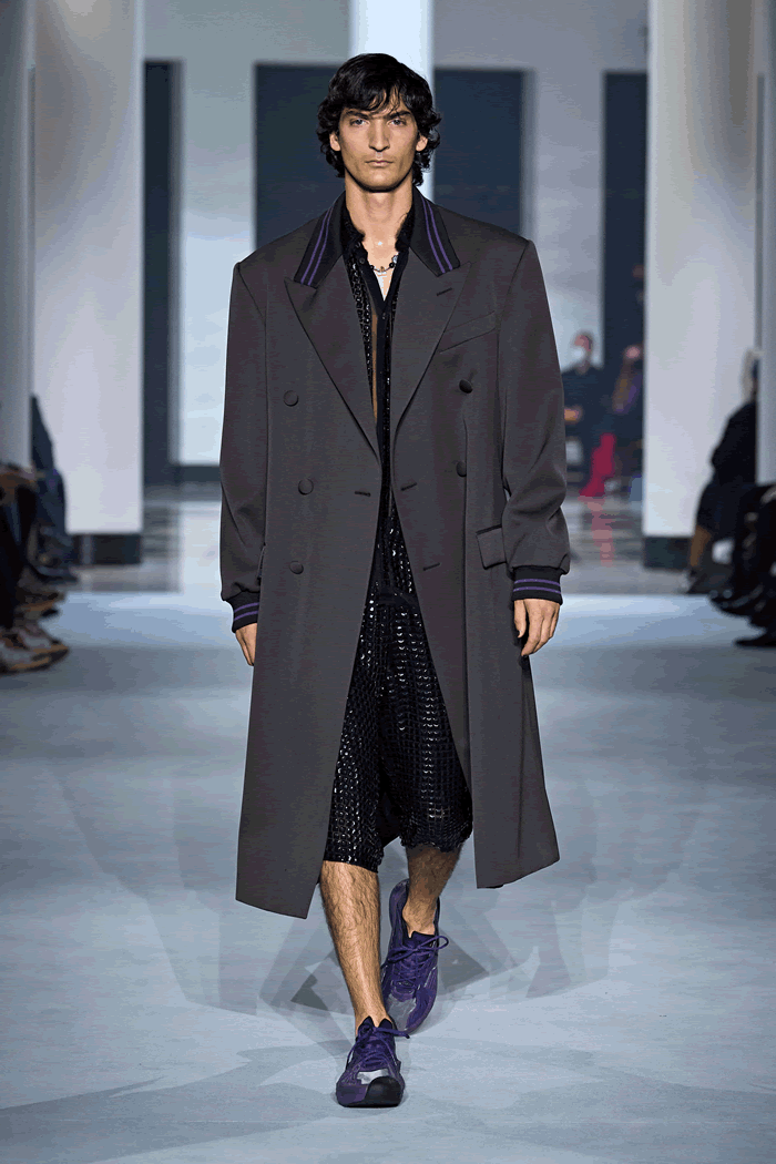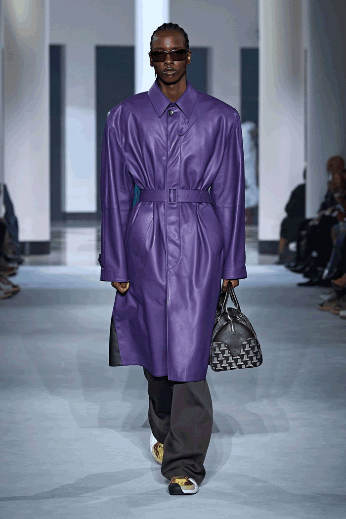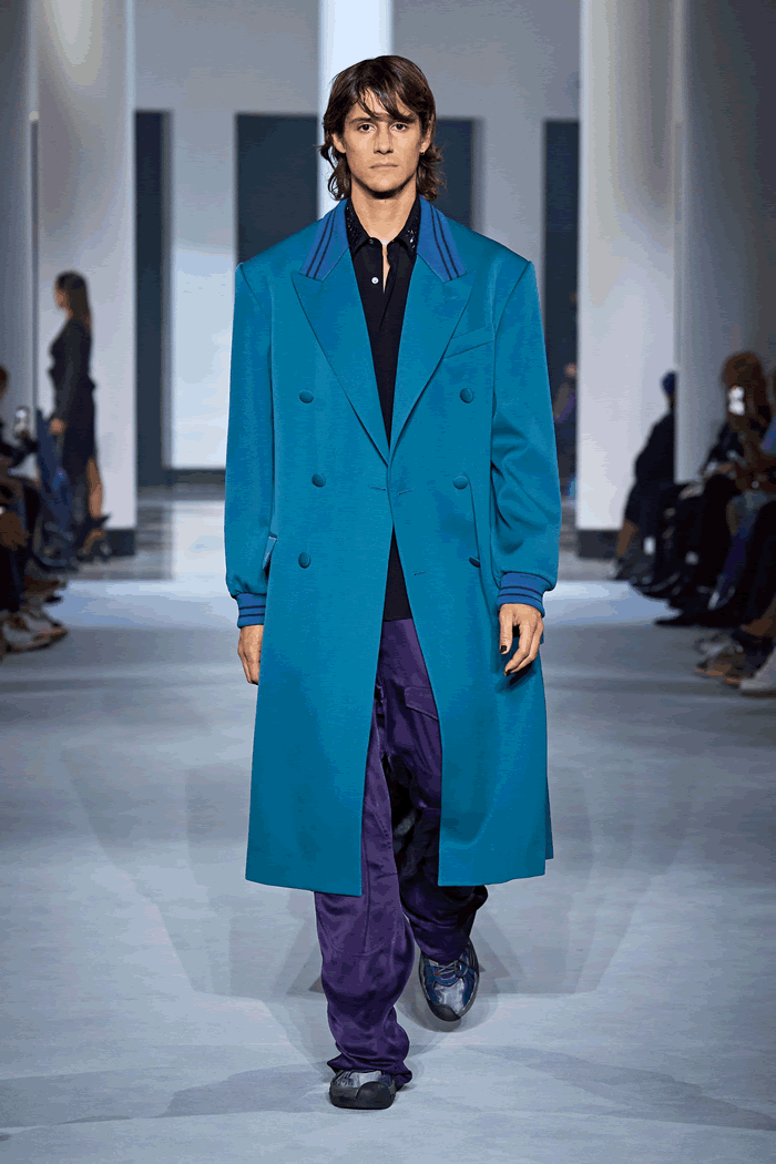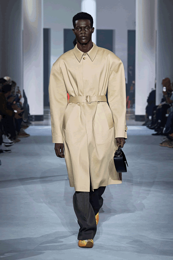 In this case, the broad-shouldered silhouette of the Batman universe drew a Tamara de Lempicka–esque line, which made Sialelli’s Lanvin man feel a little more mature. That feeling was echoed in two beautifully cut trench coats, which hung off the body almost like evening dresses. If Naomi Campbell has her own Bat-Signal lighting up the skies, someone summoned her last night: The supermodel closed the show, wafting through the Salle Pleyel in billowing black chiffon like the Caped Crusader.