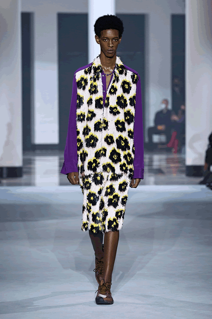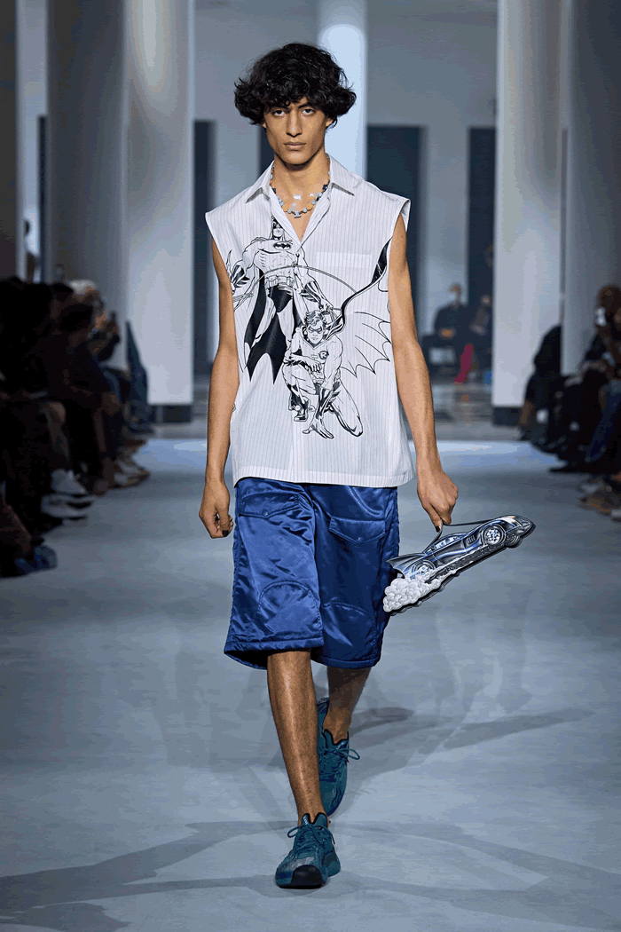 “Most of the customers that come to us are coming to get supported by glamorous, fabulous products. They search for an elevated and more confident version of themselves.” Those facts encouraged him to push the envelope further. In what he called a “bold and joyful and free and unapologetic” proposition, the designer explored Pop-Arty daisy prints, dense tinselling, and motifs from 1940s Batman comics.
