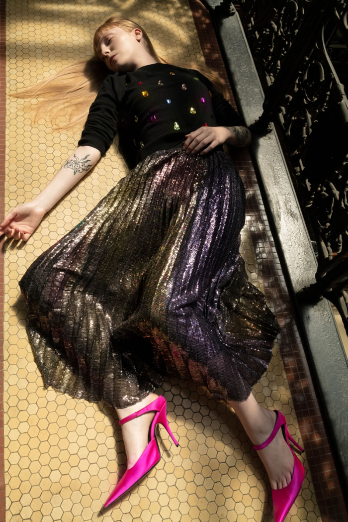 Standout pieces: Rhinestone-embroidered jeans and cutoff jean shorts (embellished denim is back!); crystal scattered, moody blue tie-dye cashmere sweater; “Hidden gems” gemstone print pencil skirts and bow blouses; feathered and beaded flapper minidresses; sun or moon-embroidered velvet robe minidresses; cosmic rainbow sequin motif knife-pleated skirt; “Chakra Khan” cardigan jacket; “Malibu days and Hollywood nights” music playlist T-shirt.