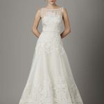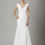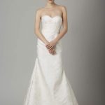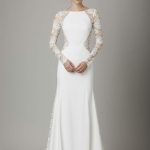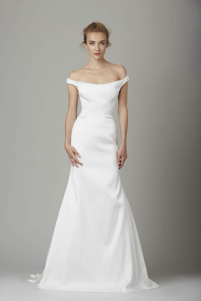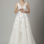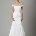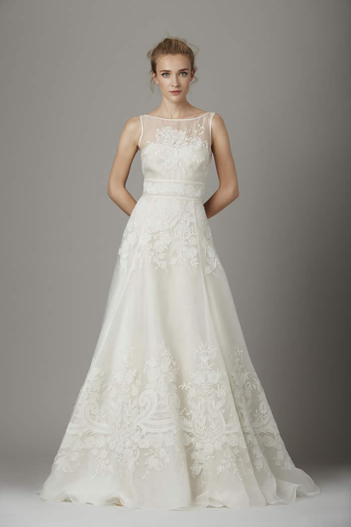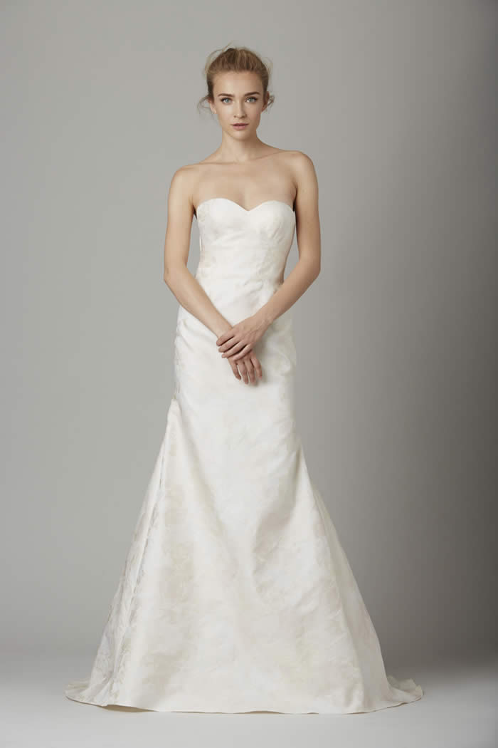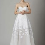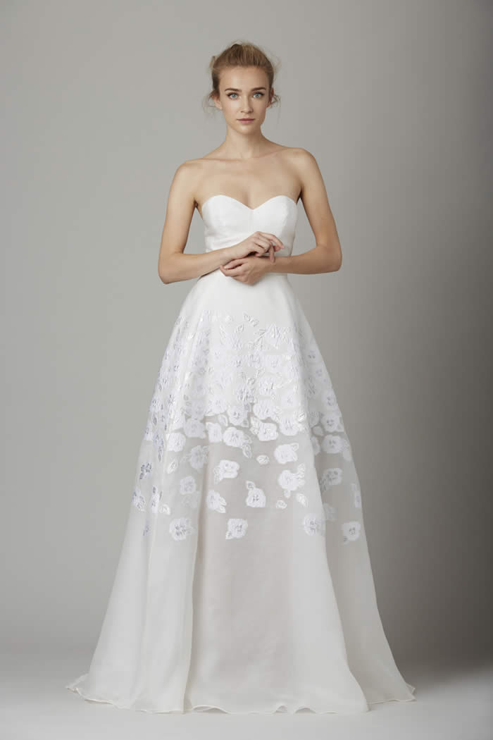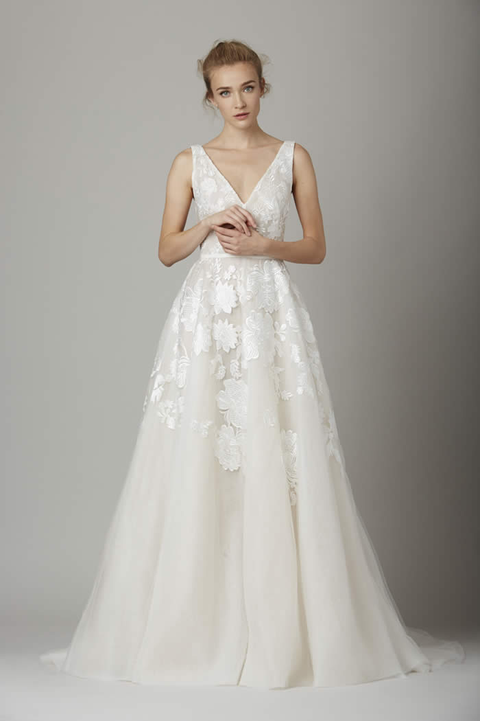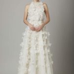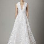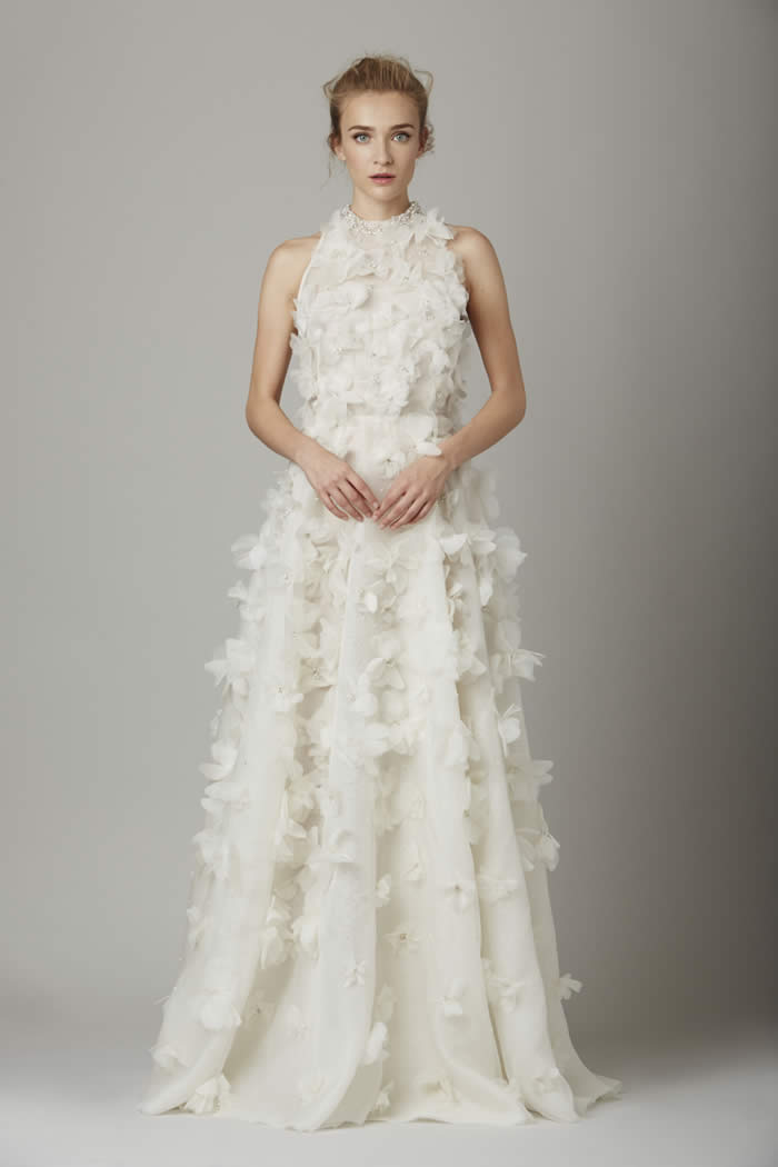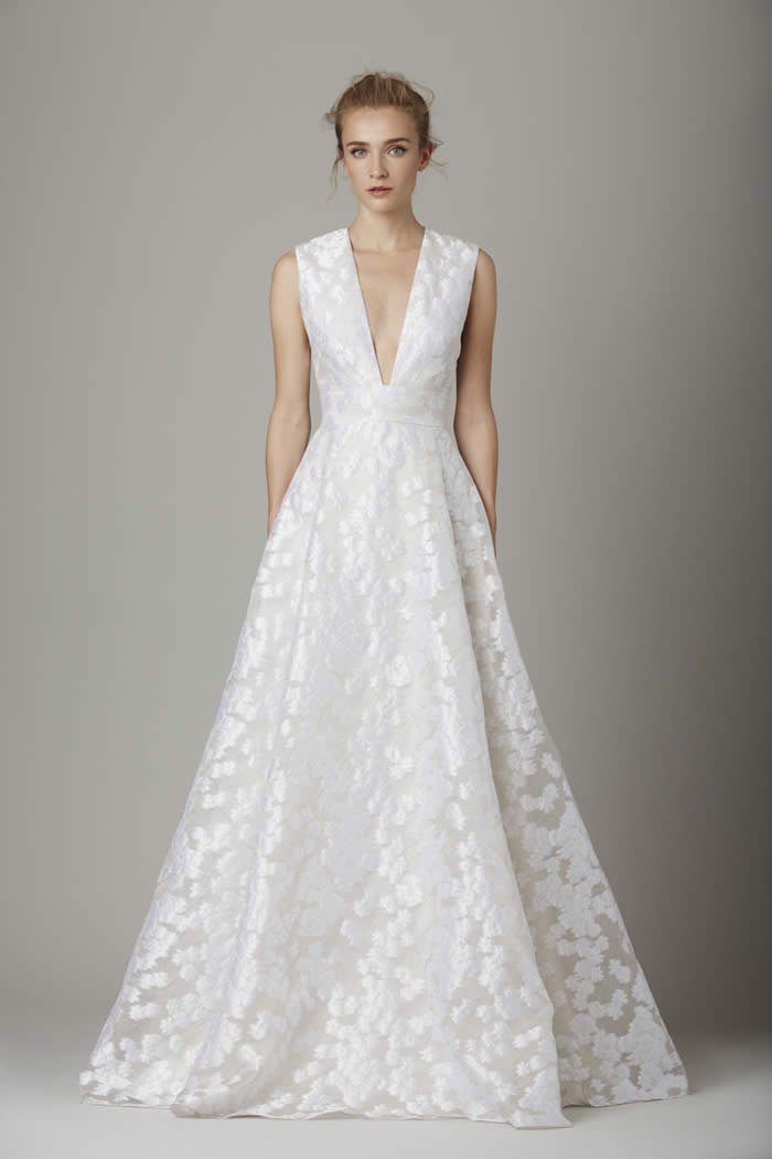 In her ultrafeminine fall bridal collection, Lela Rose worked a range of textural fabrics, such as silver metallic fil coupé and silk jacquard with subtle pink undertones, on A-line, mermaid and fit-and-flare silhouettes. One standout gown with an open V-shaped back featured waxed, threaded embroidered tulle in a floral pattern, but even Rose’s less-embellished looks an off-the-shoulder satin gown with cascading pearl trim and a tulle train, for example proved equally elegant.