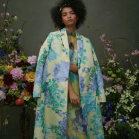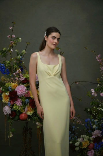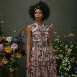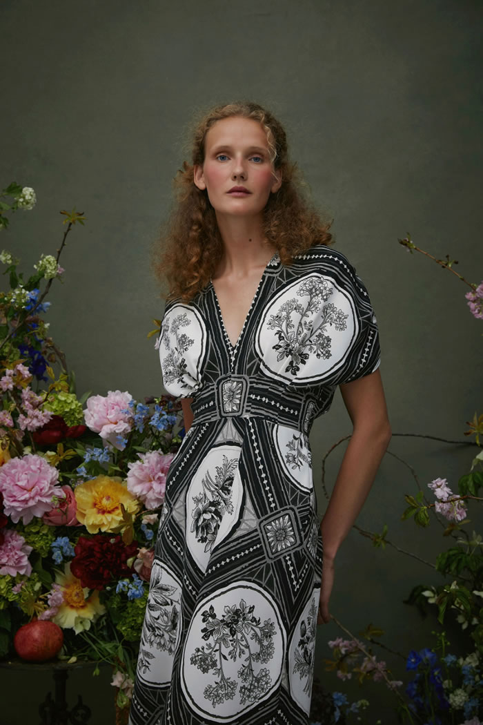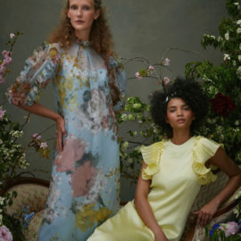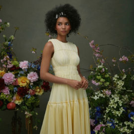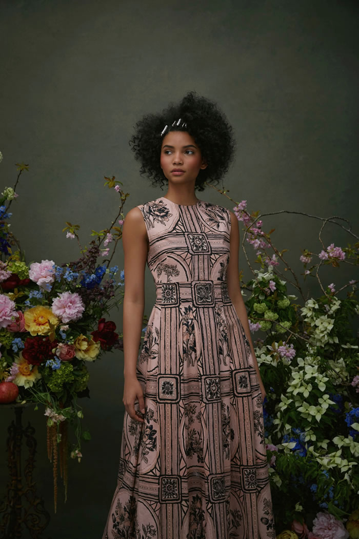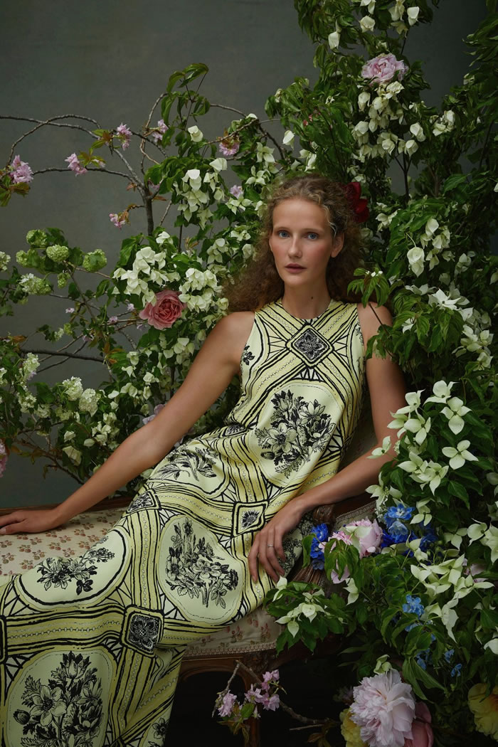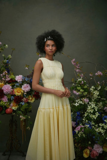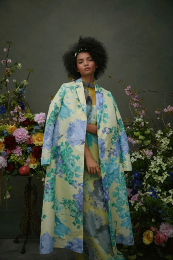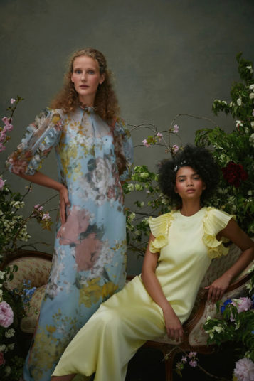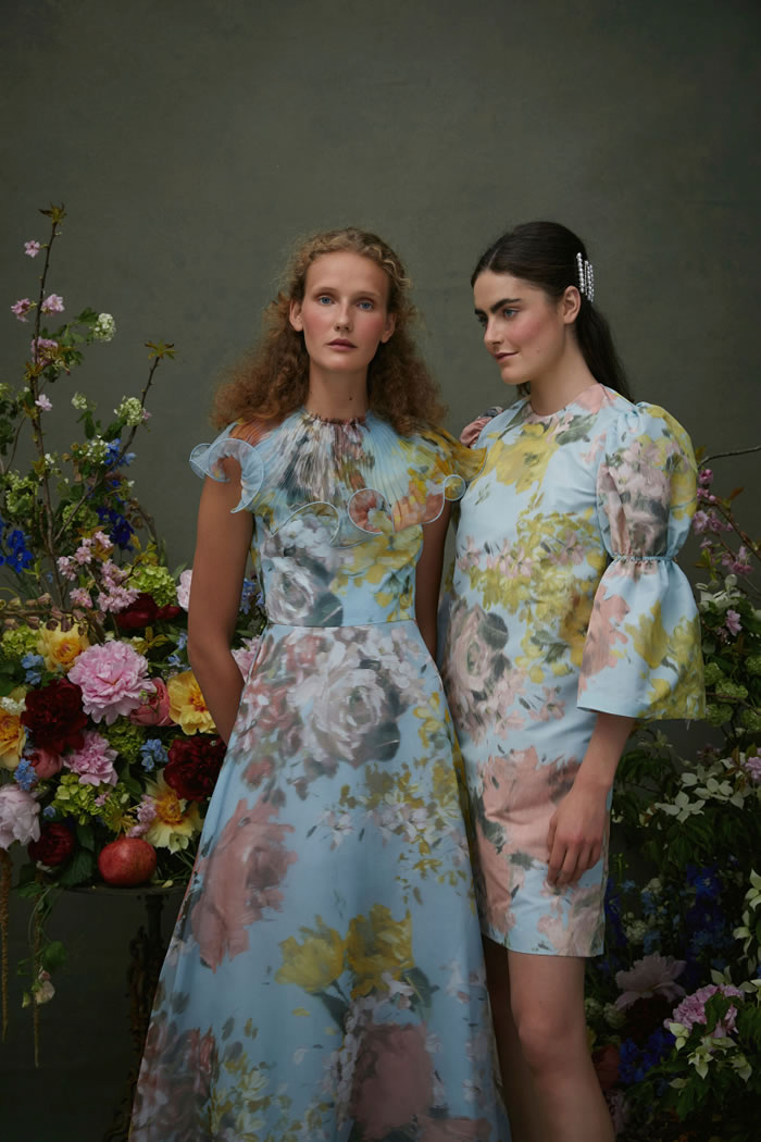 Key pieces: Uncomplicated, pastel separates (with large-scale barbell pearl-pin gathered details) and frocks with gathered, pleated or floral lace details (as in a standout limoncello day dress); painterly garden florals and medallion printed dresses (a statement printed strapless gown or lightweight number with ruffled blouson sleeves); an off-the-shoulder bustier-style dress in seafoam felt very of-the-era in a modern way.