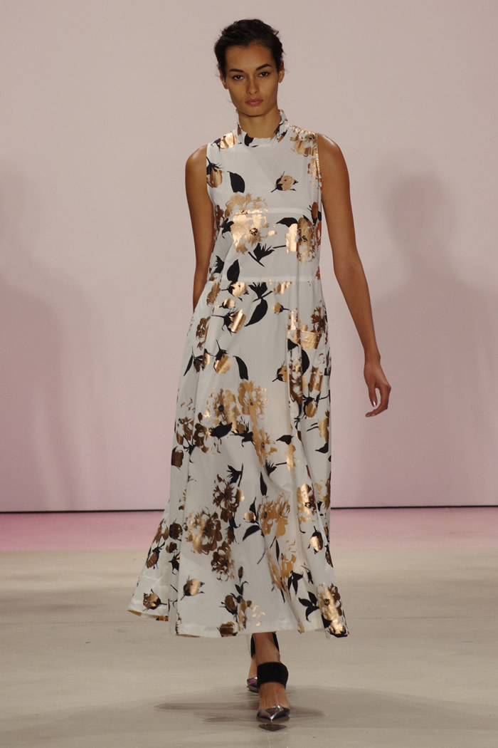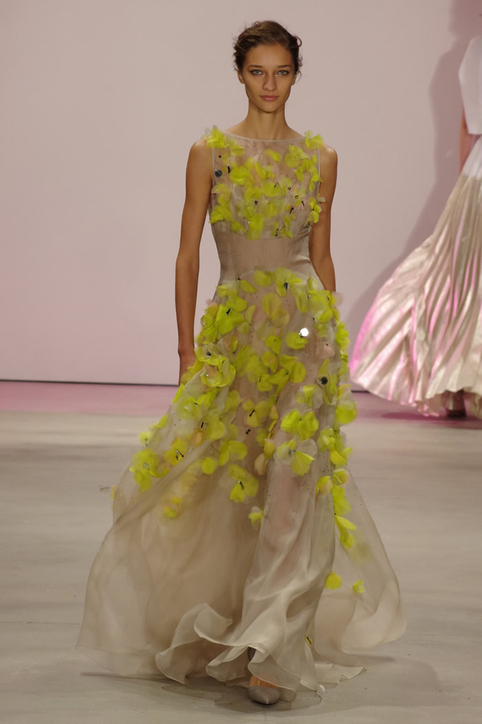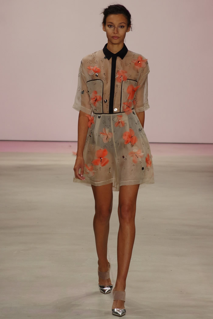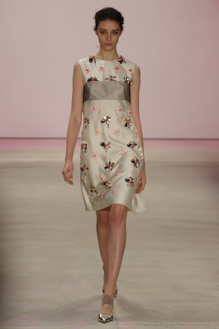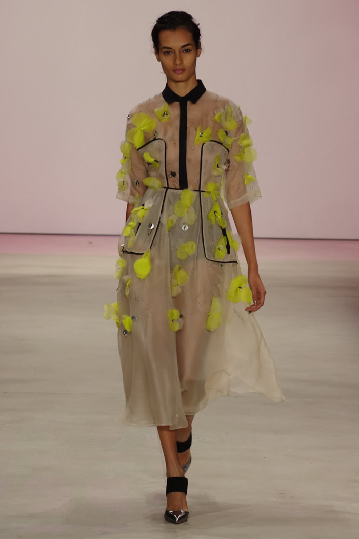 Lela Rose’s spring collection was as bubbly as the designer herself – she even created a ceiling of hanging tulips above the runway. But sometimes all that effusiveness can be a bit overwhelming in clothes. This season, Rose offered a blazing palette, shimmering metallics, hand-cut floral appliqués, magnified floral prints and quirky details. In easy, unfettered shapes it all worked; in more elaborate silhouettes, it often did not.