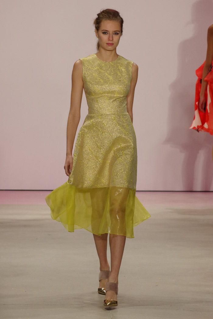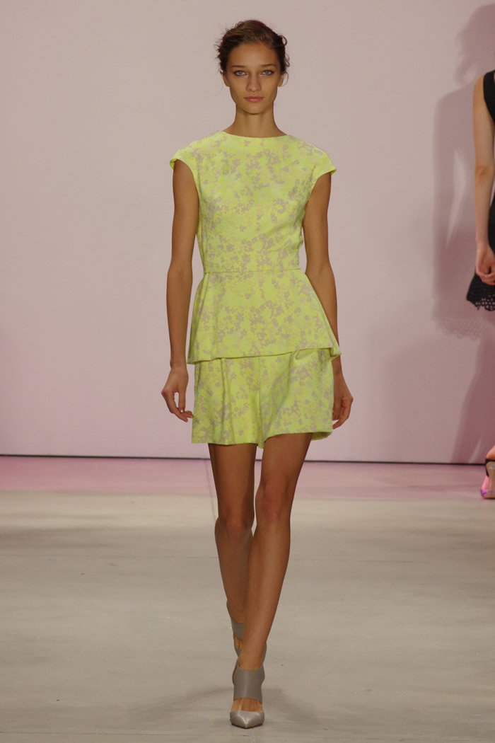 Lela Rose did succeed in making “cute” an acceptable part of her lineup. She dressed up shorts, shaping them in a silver tweed with a matching fringed jacket or in a fluorescent yellow floral jacquard with a simple top. Her best-of-show looks: a deep coral polka-dot fil coup shirtdress, a citron gown with hand-cut floral appliqués and a charming nude organza jumper.