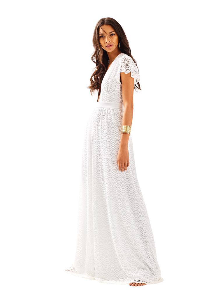 There was a playfulness with tassel embellishments on cropped tops and off-shoulder dresses, and fluidity with ruffled wrap skirts and tie-dye maxidresses.An all-white lace dress could perfectly transition from day to night. “Our goal is to get you from plane to the pool and pool to the party; you just have to change your shoes,” quipped Fain.