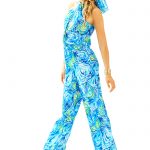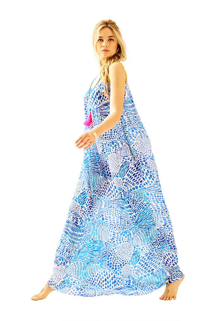As usual, the collection was heavy on caftans, tunics, jumpsuits, off-shoulder dresses and other breezy and loose silhouettes done in custom lace and silk and those signature Lilly P prints.To fit the theme “Life Under Printed Palms,” designer Mira Fain and her team hand-painted exotic flowers and whimsical scenes: a monkey hidden behind trees on a breezy top, elephants blended with fauna on a short caftan and other critters and sea-life sprinkled throughout.