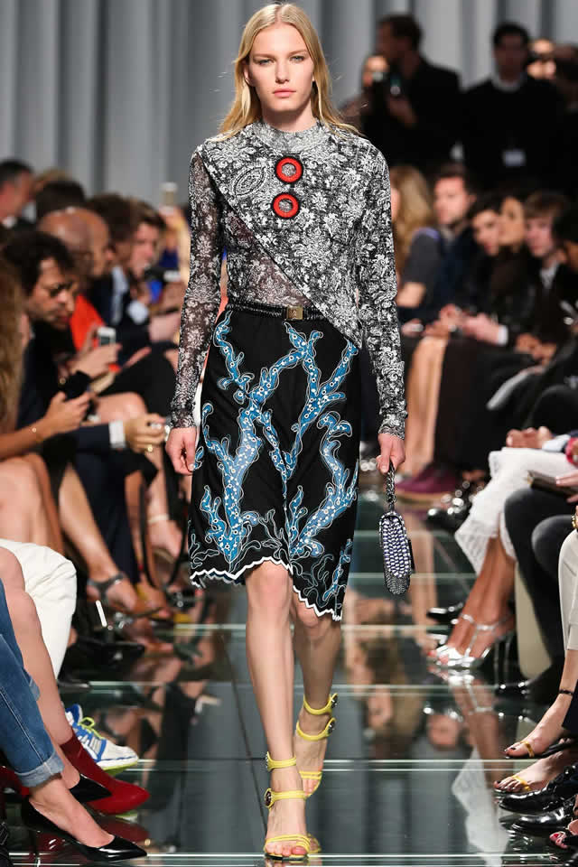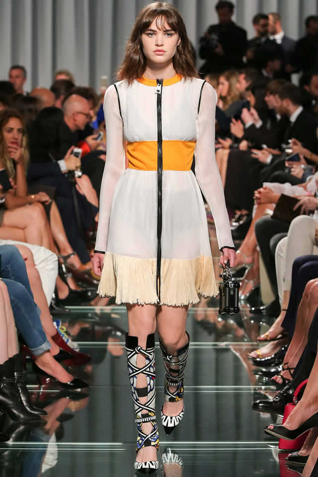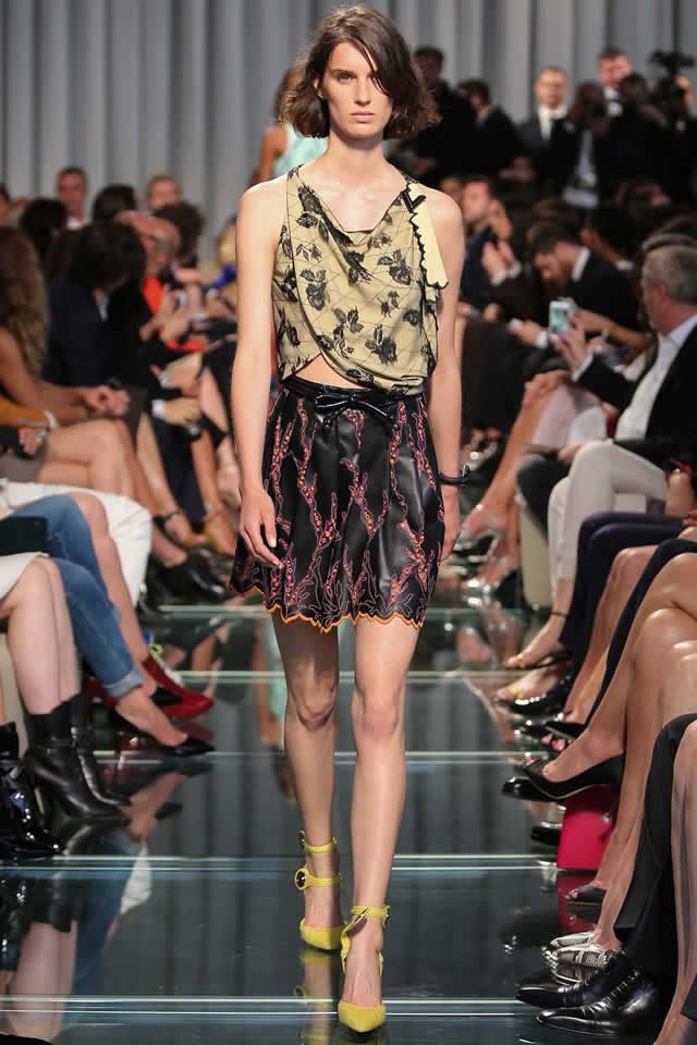 The Cruise collection, Ghesquière’s second show for the LVMH powerhouse, was an elaboration of his first. He’s still thinking about "a wardrobe," but these clothes were significantly more embellished than what he did for Fall, and, by extension, more playful. Ghesquière appeared to be having quite a good deal of fun: collaging mismatched prints, embroidering lace with tiny seed beads, and accessorizing with spiky silver belts and gladiator sandal,boots that inched up toward the knees. Deep pink was paired with baby pink, and caution orange with yellow and sea blue,"a game of colors," he called it. It made his debut look almost austere by comparison.