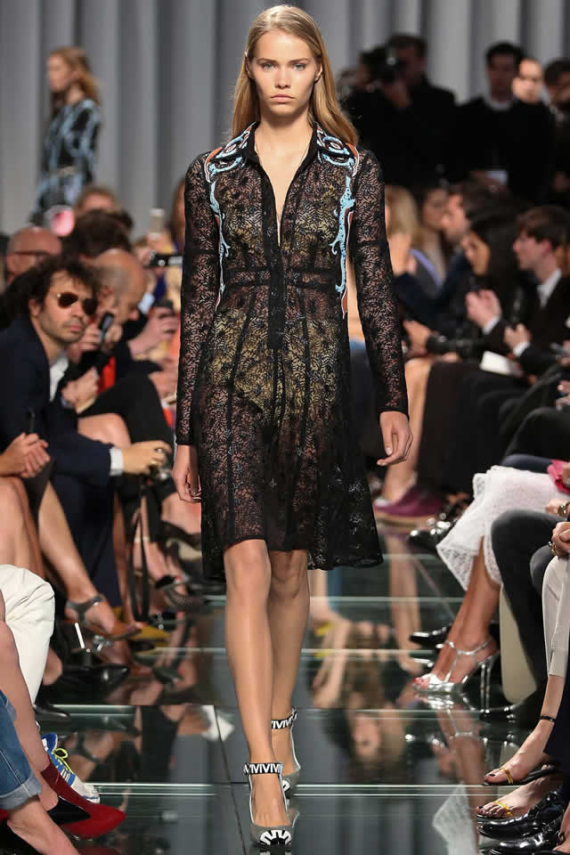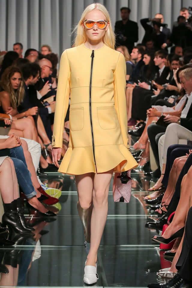 At Vuitton’s March show, the blinds louvered open; here, the curtains closed and moving images of water flowing over rocks, shot by the artist Ange Leccia in Corsica, began playing on the video screens installed in the floor. " liked the spirit of the girls walking on digital water," Ghesquière said, referring to the Oceanographic Museum around the corner from the Palace. Aquatic motifs extended to the clothes.