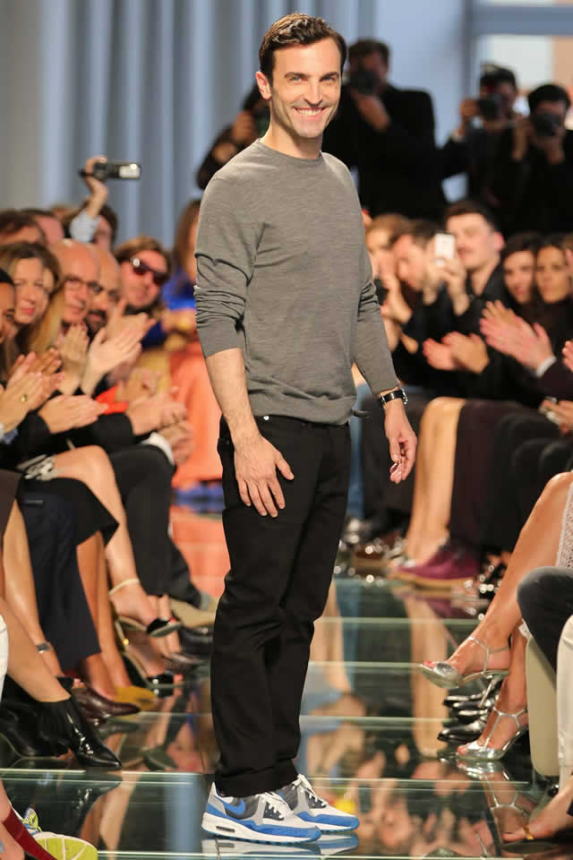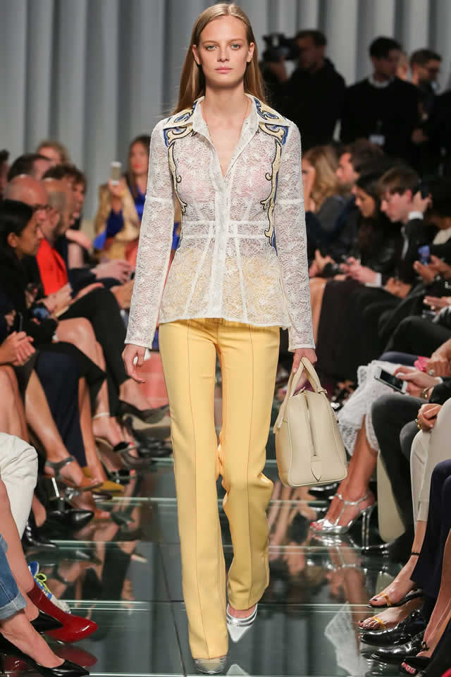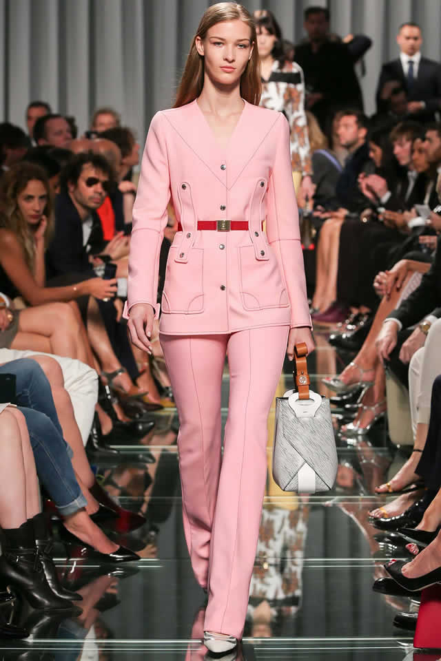 Ghesquière is still liking the fit, and, flare silhouette he introduced for Fall, but there was more diversity on the runway tonight. High, waisted, slightly flaring trousers will stir memories for fans of the leg, elongating pants he used to make at Balenciaga; on the other hand, embroidered slips with scalloped hems were among the least structured things he’s ever done.