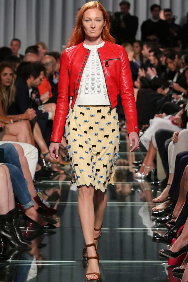 Coral branches were embroidered on a flaring, knee,length skirt, and the printed top it was paired with was decorated with two cutout portholes. Formula One, another Monégasque reference, got callouts of its own in the form of a snug racing car red leather jacket and a jersey dress printed with a checkered flag motif.