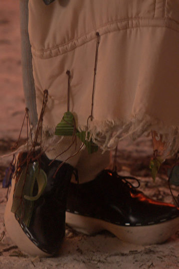 Galliano is always pushing for progress, experimentation. Nevertheless, with their little cotton Netherlandish hats and kerchiefs, their tabi-clog waders, and their romantic, shredded piratical looks, the Margiela Muses looked more purely Galliano than they have done for many a year.