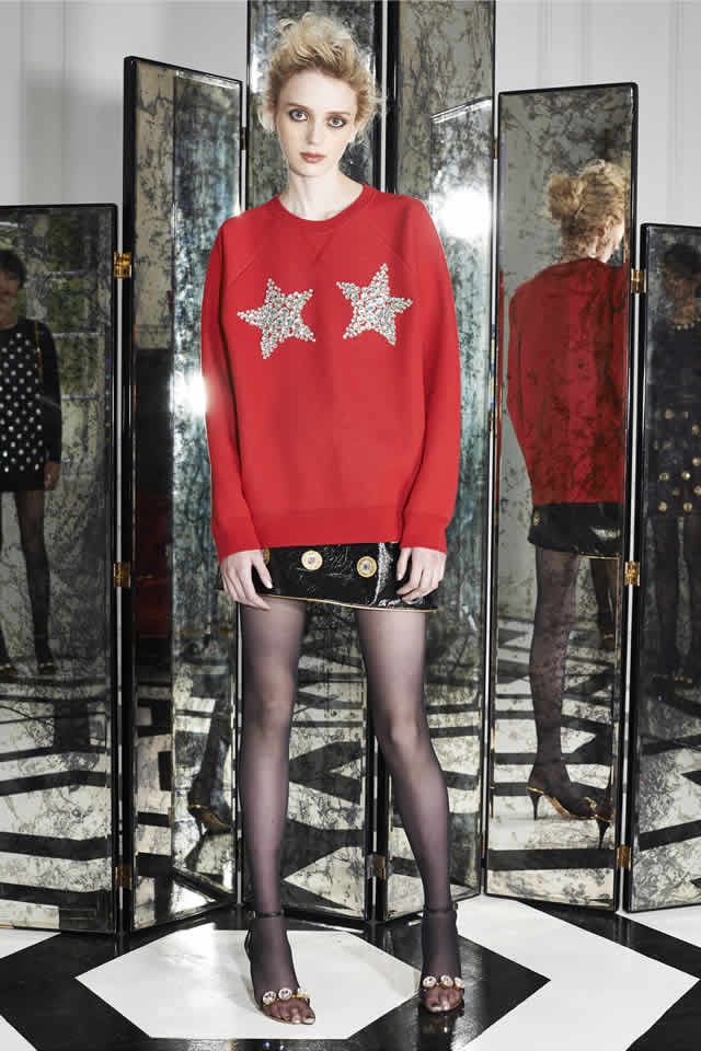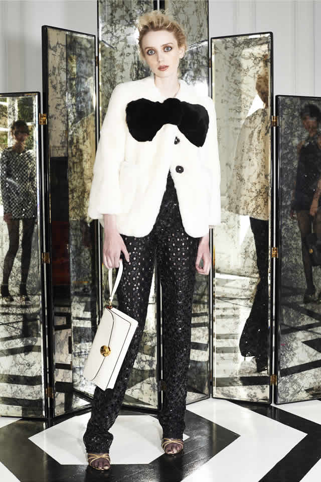 Carter and co. nodded in the direction of more casual occasions with a red sweatshirt embroidered with crystal stars on the chest (the descendant of MJ’s popular Coca-Cola sweatshirt for Spring ’14) and a crinkle leather mini. But it wasn’t all leggy all the time. There was a pantsuit in acid-bright abstract floral silk chiné, and one of the best looks in the show was a pair of skinny sequined black guipure flares topped by a white rabbit fur jacket complete with a built-in bow.
