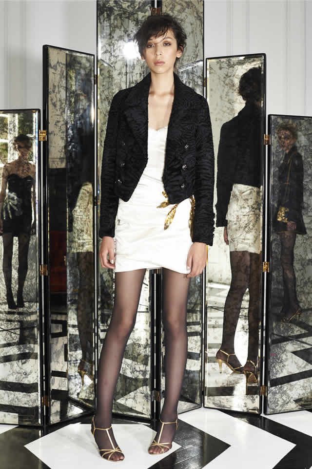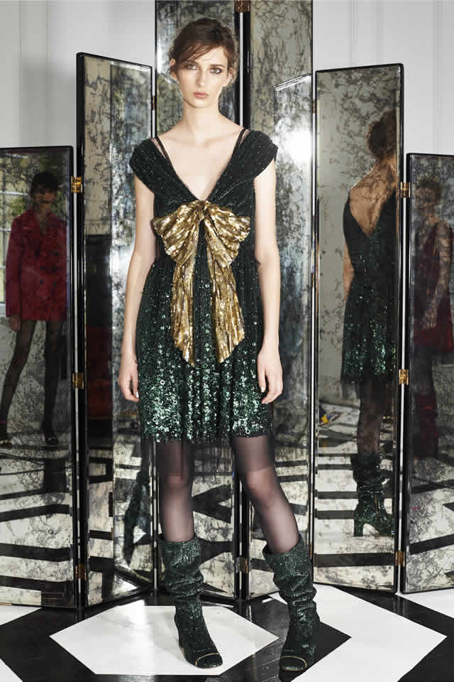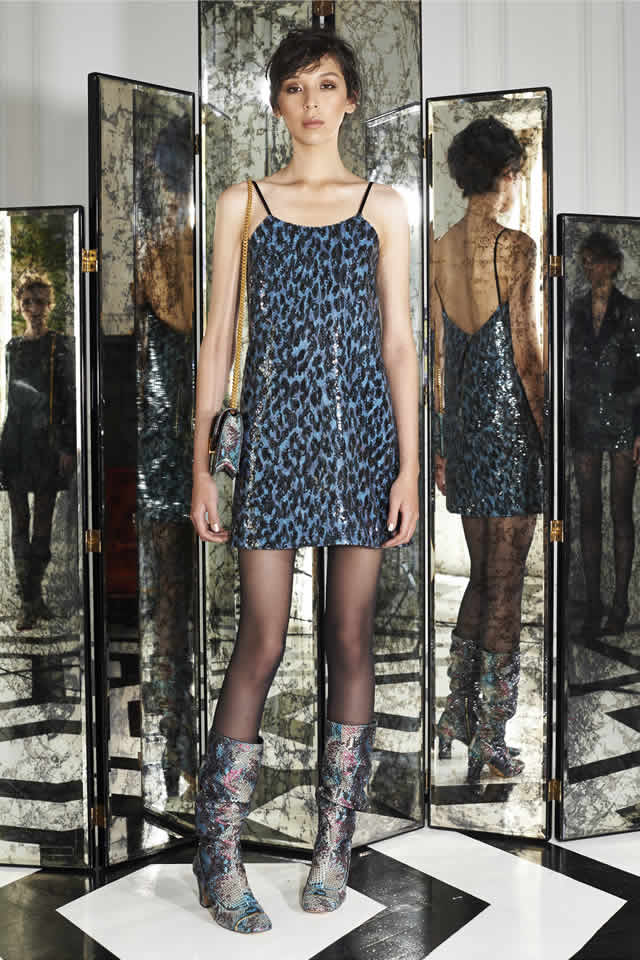 Marc Jacobs has your next New Year’s Eve dress all sorted. His Resort collection, which was presented outside the showroom for the first time in an Upper East Side town house, was devoted almost exclusively to party clothes. Dolly bird minidresses in black guipure lace, jewel-toned crushed velvet, or leopard-printed sequins worn with sheer black hose and strappy heels or slouchy go-go boots formed the crux of the lineup. "People getting dressed up, going out. Happy, lively," offered Jacobs’ design director, Joseph Carter, when he was asked for a few words backstage.