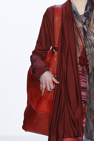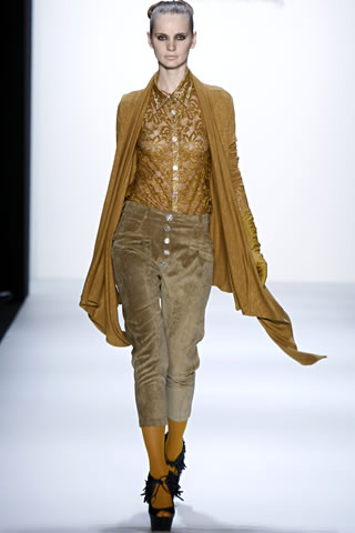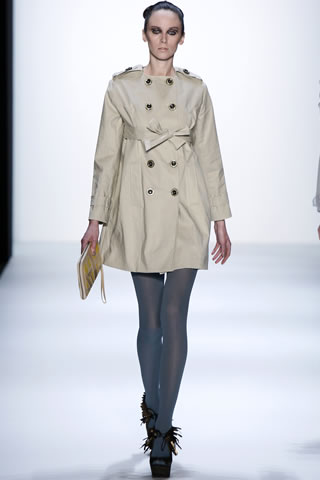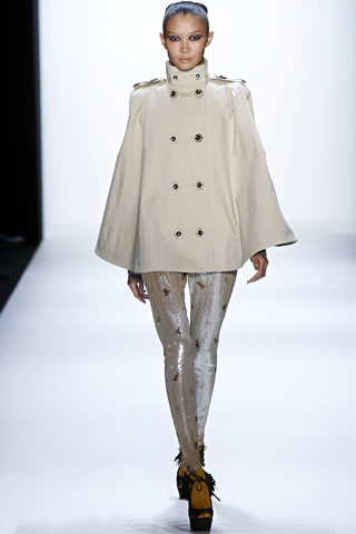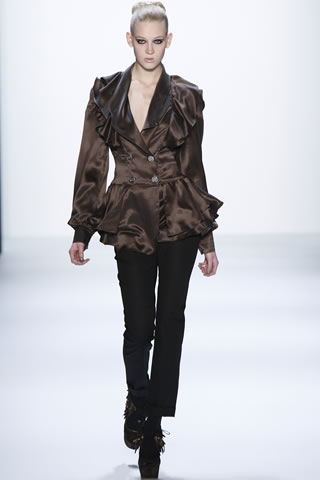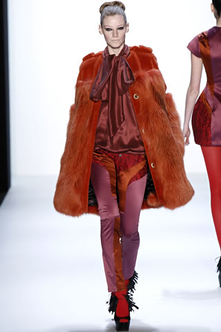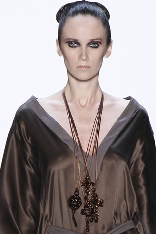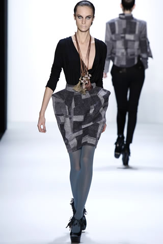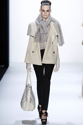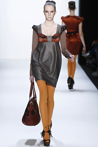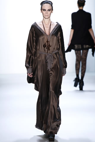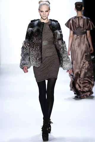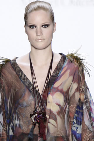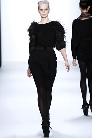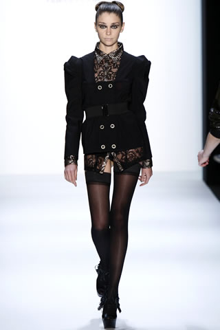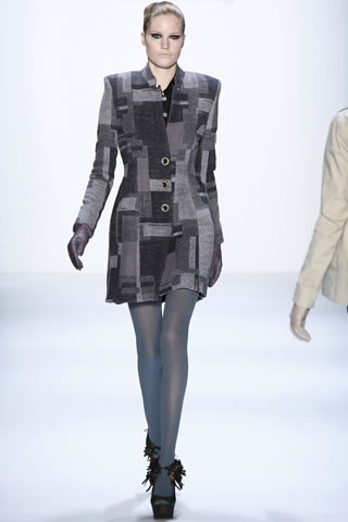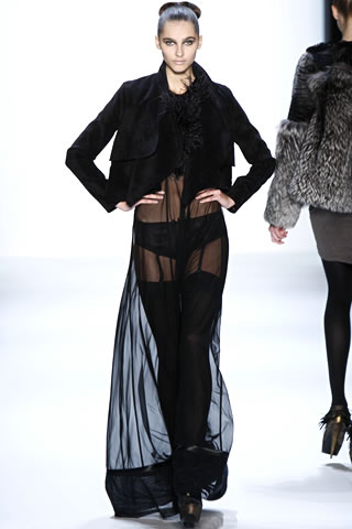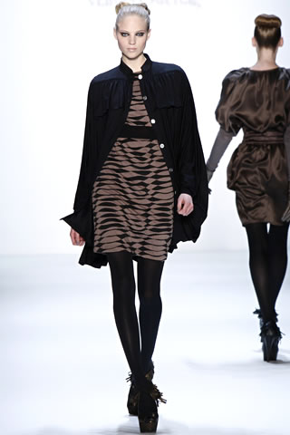 Natural-coloured silk dresses are worn under uniform-style coats; dark, oversize silk blouses are ornamented with juicy red ribbon elements. Like men´s tailoring, thick wool in shades of grey, pervaded by graphic patterns, is cut tightly to the figure. Cashmere is processed into jackets, dresses and coats. Furthermore, we find extra-large crystals sparkling on shoulder parts. Delicate black feathers combined with black transparency become a fatal liaison outfit. When taking a closer look you can vaguely guess what is worn underneath. Infamous lace and suspenders are worn under trench coats and thereby ensure playful elements of surprise. Thanks to see-through elements, flowing evening dresses attract attention to what is worn underneath. Short fur jackets are worn over cocktail dresses and miniskirts are combined with short coats. That is what lends the autumn/winter 2010/2011 collection international glamour.