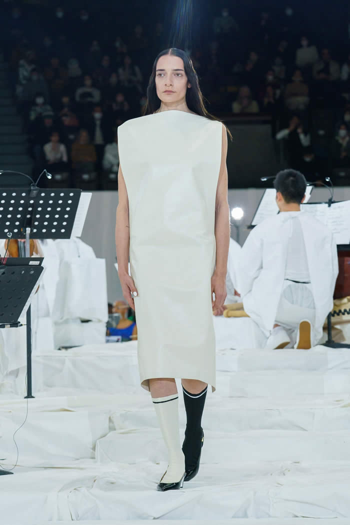 He looked serene, and rather cool, in an ascetic-chic all-white outfit, wearing a slender goatskin coat over pajamas cut from sheets of pristine, rustling wrapping paper. Thick yellow and red paper covered the couch and armchair where we sat for the interview, and massive quantities of stark-white paper were laid out on the wooden floor and podium of the indoor arena in the Yoyogi National Gymnasium where the Marni show was held.