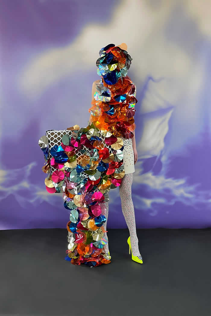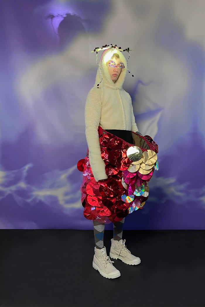 One thing the pandemic has underlined in preventing physical fashion weeks is that the location of designers has pretty much ceased to matter. Separation anxieties apart, that’s a boon in disguise for localists like Bovan. Creative flow uninterrupted, he made even more of an effort to source regional British materials, including cloth from traditional U.K. mills like Hainsworth and giant sparkly bits made by The Sustainable Sequin Company, and had a hand-knitter around the corner from him knitting up a storm.