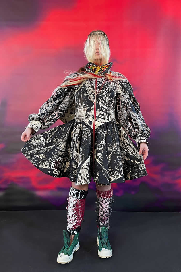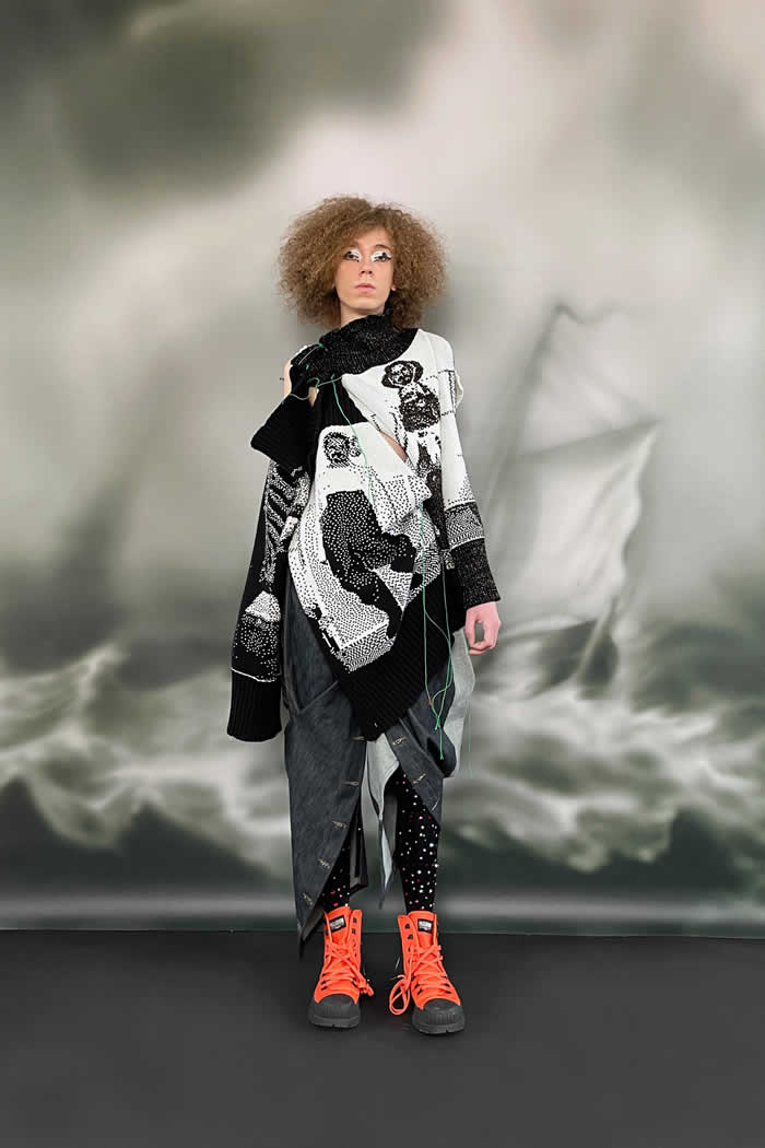 History always plays a role in Bovan’s scenarios, never literally, but continually surfacing from the depths of old English references that often chime with ideas about medieval, Tudor, and witchy things. There’s a black and white dress with a full peplum that Bovan printed with sailing ships.