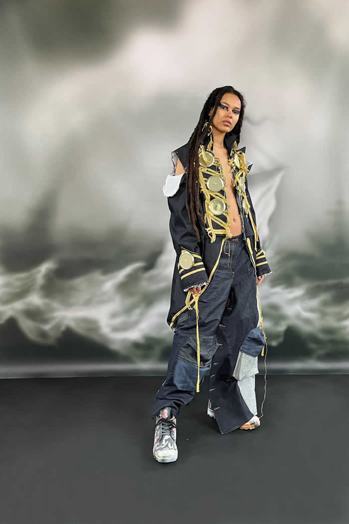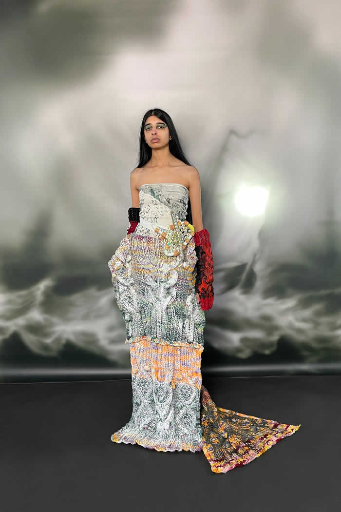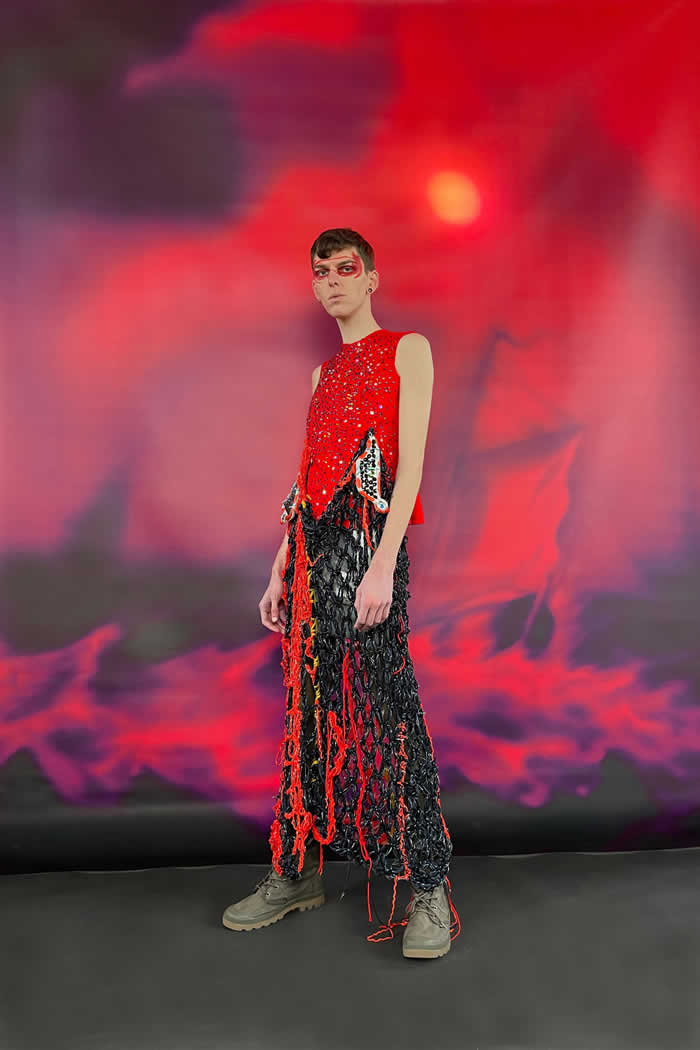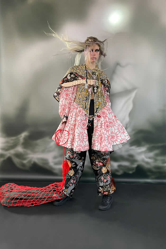 Not to heap too much heaviness on the vast fishnet shoulders and collapsed gauze curtain that float like a ghost ship across the floor in Bovan’s first look, though. It’s actually more like the kind of DIY costume any avant-garde art school kid might dream of putting together for a club night. Bovan represents that freedom among his cult followers too.