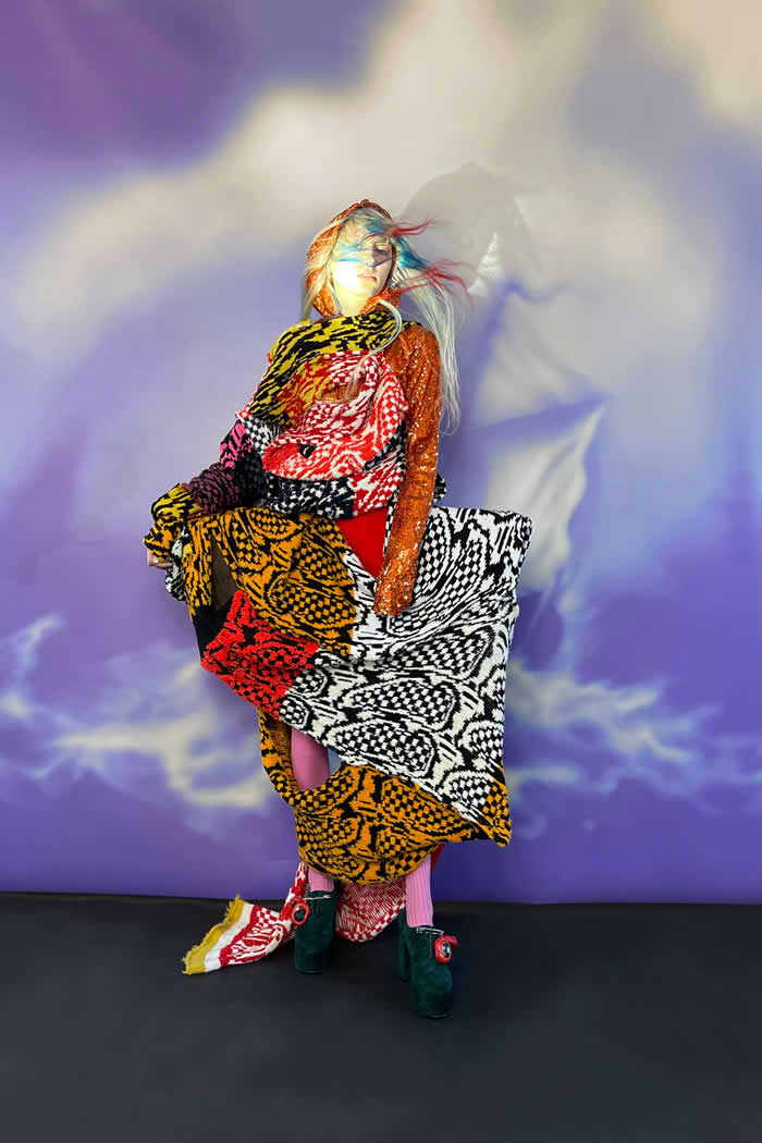 The smeary, glitchy psychedelic color effects that work their way through Matty Bovan’s fall video are a digital analogy for the vigorous free-form way that he’s always scrambled color, pattern, paint, and garments as if they’re materials on an artist’s palette.