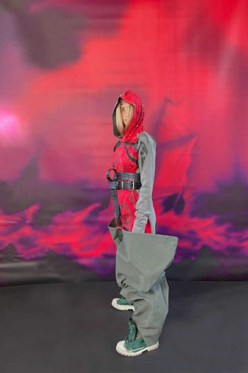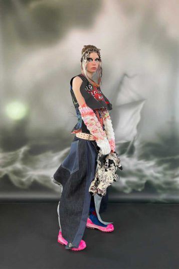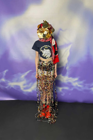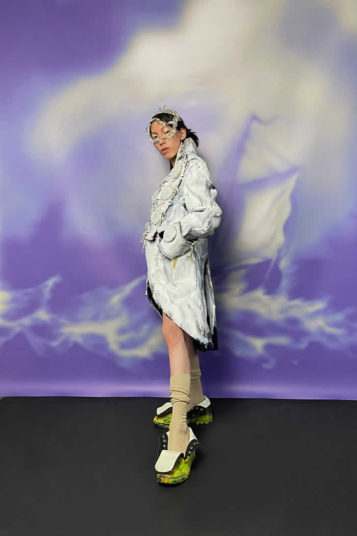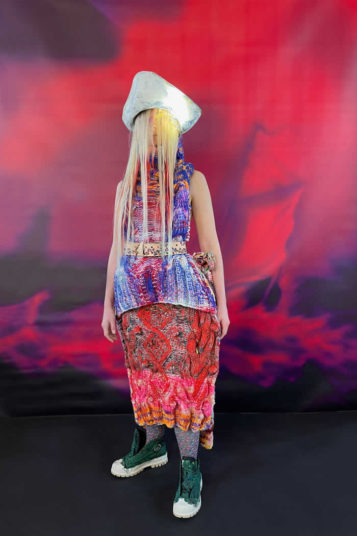 Not to heap too much heaviness on the vast fishnet shoulders and collapsed gauze curtain that float like a ghost ship across the floor in Bovan’s first look, though. It’s actually more like the kind of DIY costume any avant-garde art school kid might dream of putting together for a club night. Bovan represents that freedom among his cult followers too.