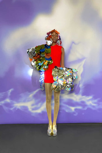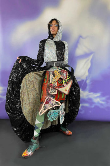 One thing the pandemic has underlined in preventing physical fashion weeks is that the location of designers has pretty much ceased to matter. Separation anxieties apart, that’s a boon in disguise for localists like Bovan. Creative flow uninterrupted, he made even more of an effort to source regional British materials, including cloth from traditional U.K. mills like Hainsworth and giant sparkly bits made by The Sustainable Sequin Company, and had a hand-knitter around the corner from him knitting up a storm.