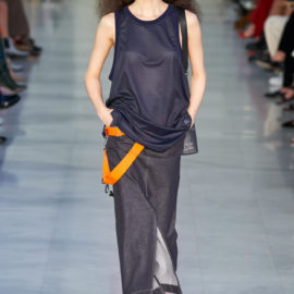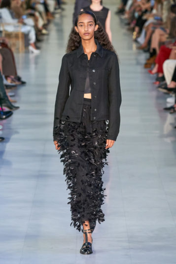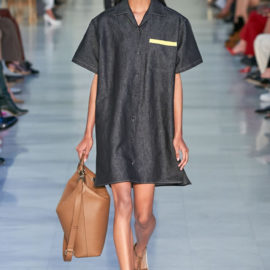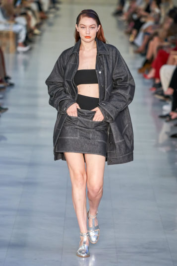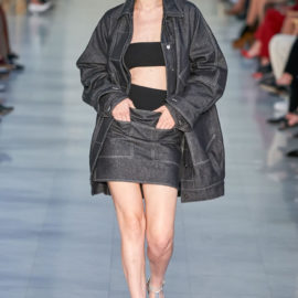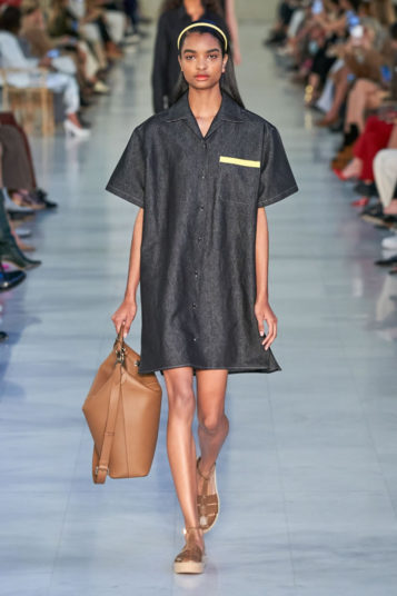 The evidence of that was on today’s Max Mara runway in clothes that took their shape and attitude, not from officewear but workwear, much of it is rigid, dark-rinse denim.