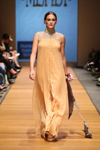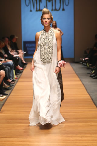 Eden Dawn of “24notion” wrote, Designer MOHAMMAD MEHDI based out of Pakistan flew across the world to showcase his work at Portland Fashion Week. A truly international designer his collections are found in Lahore, Karachi, Islamabad, New York, Los Angeles, Manchester, Dubai and soon Portland will be added to the list. His designs are from another time and make you feel as if you should be lying around a courtyard, next to a giant fountain burbling while you gently fan yourself in an aristocratic manner. Floating sheers, combined with brocade and trimmings create lovely, theatrical garments. A bridal piece with touch of crimson displayed his design aesthetic marvelously.