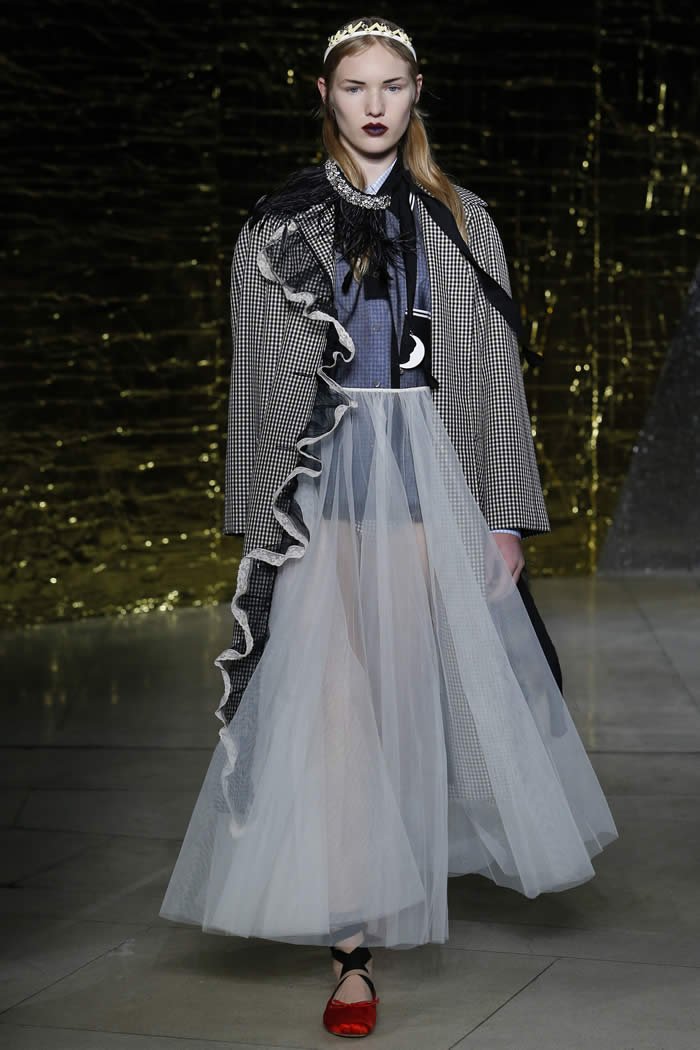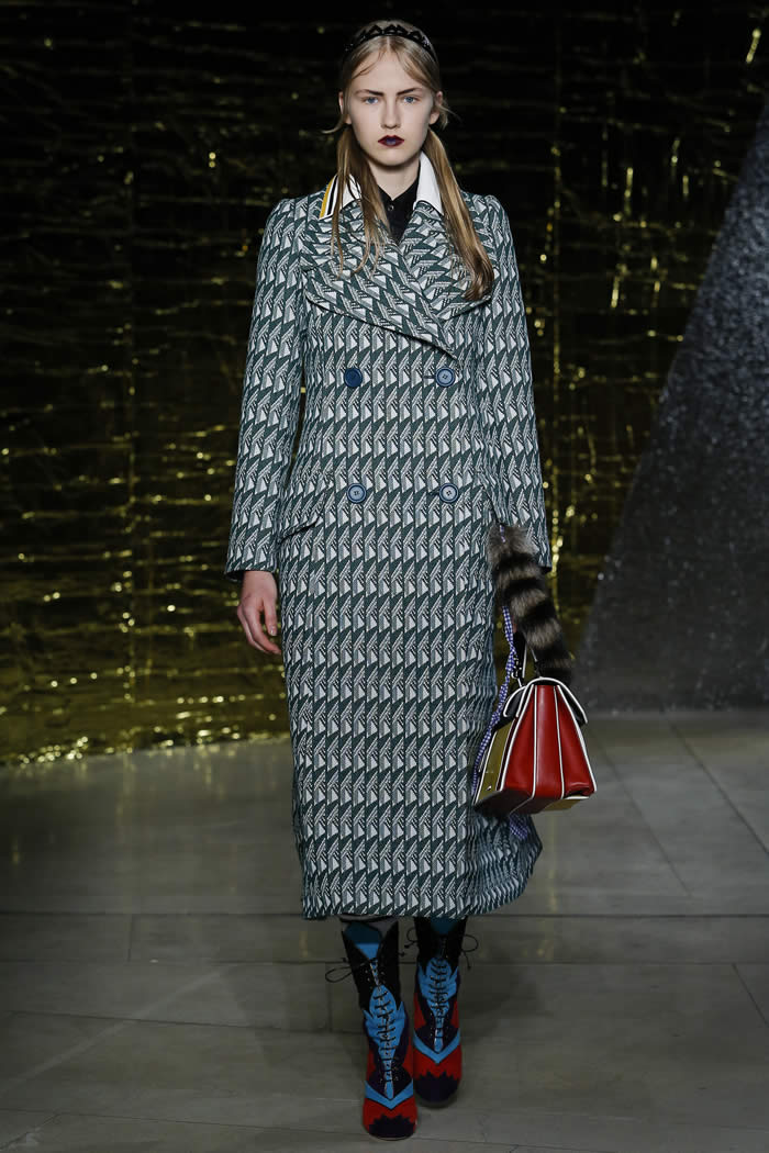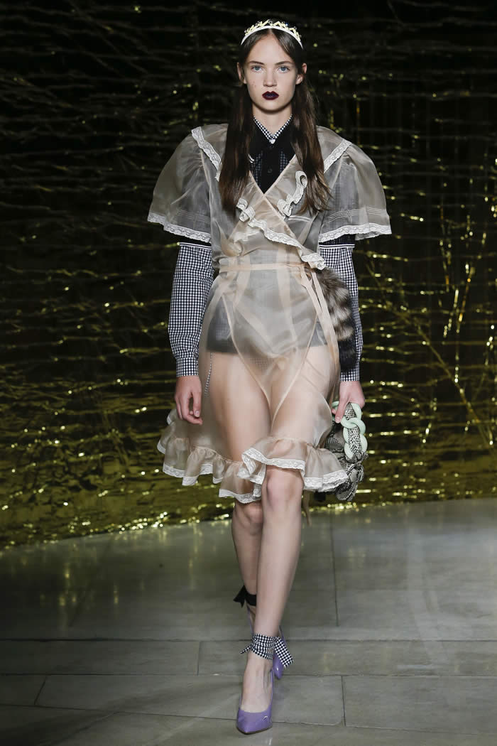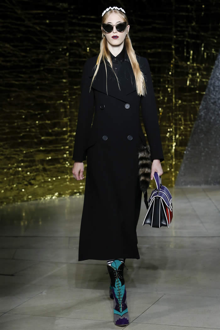 The season’s fetish items powered up each look, particularly in the accessories: fabulous fur stoles with tails as well as shoes that veered between colorful, sparkly platform drag-queen dream boots, and bondage ballet flats bound with a bevy of straps. Contrasts were everywhere, yet for a show about irrationality, the clothes made perfect sense, especially within the Pradasphere.