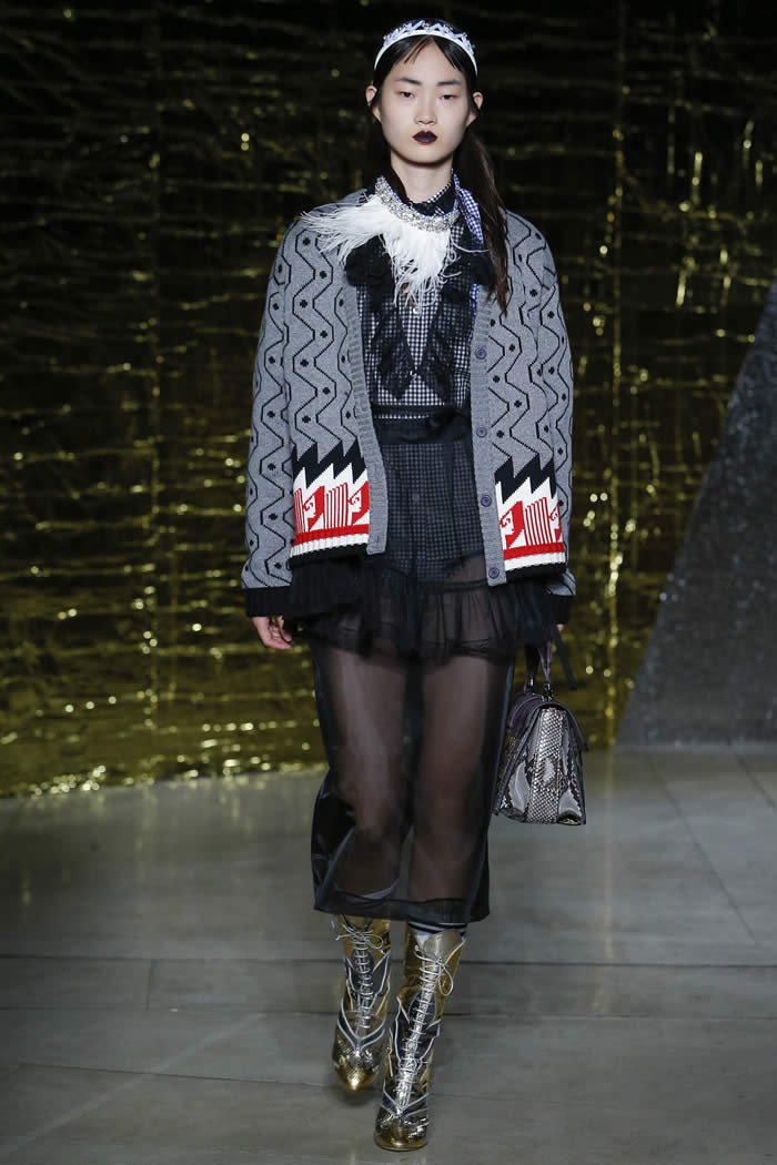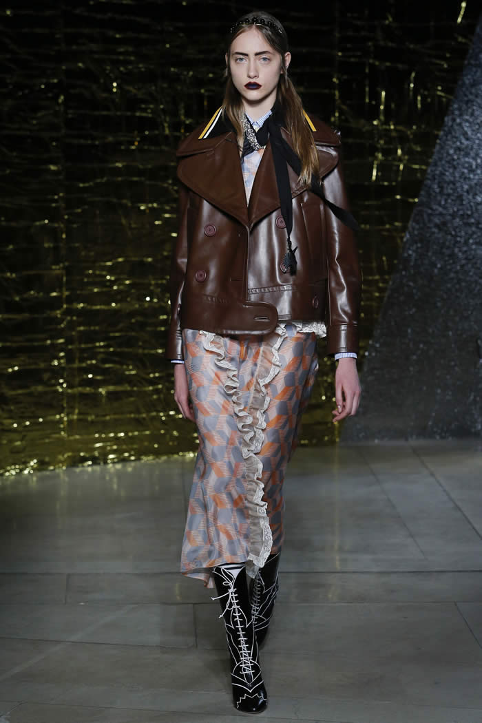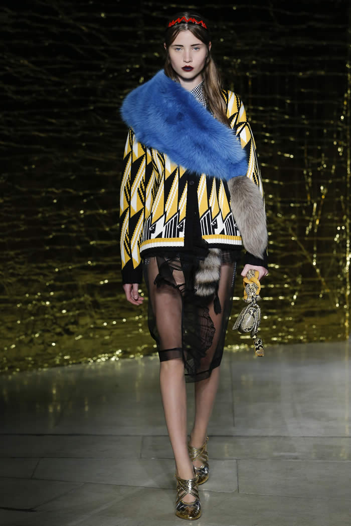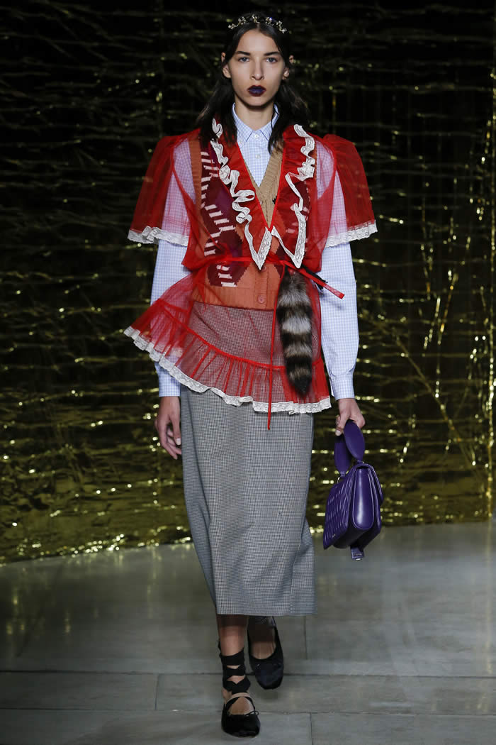 Working from the house-specific taste for retro, spanning roughly the Fifties to the Seventies, Prada built lean, polished silhouettes out of discordant pieces. The looks gave the impression of good girls/ladies in headbands and neat, tailored jackets over straight, secretary skirts, but Prada sent them appealingly off course via erratic colors, patterns and delicate perversions. A short, boxy red leather jacket had diamond patterns down the front that clashed with a turquoise skirt with a raccoon fur tail trailing off. Sheer pretty-baby nightgowns looked deliberately naïve and cheap (though they most certainly won’t be) layered with primly buttoned-up shirts, skirts and a range of refined leather coats.