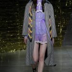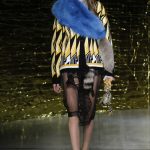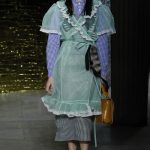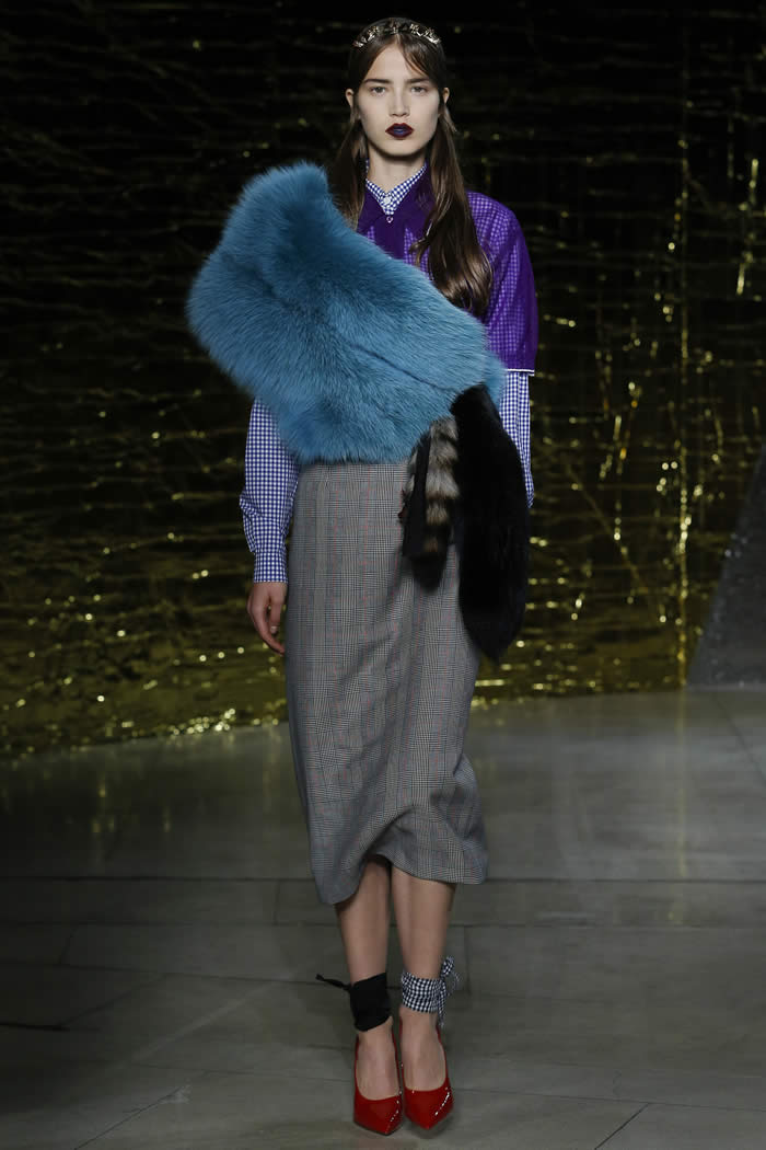 The season’s fetish items powered up each look, particularly in the accessories: fabulous fur stoles with tails as well as shoes that veered between colorful, sparkly platform drag-queen dream boots, and bondage ballet flats bound with a bevy of straps. Contrasts were everywhere, yet for a show about irrationality, the clothes made perfect sense, especially within the Pradasphere.