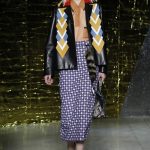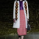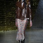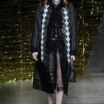Working from the house-specific taste for retro, spanning roughly the Fifties to the Seventies, Prada built lean, polished silhouettes out of discordant pieces. The looks gave the impression of good girls/ladies in headbands and neat, tailored jackets over straight, secretary skirts, but Prada sent them appealingly off course via erratic colors, patterns and delicate perversions. A short, boxy red leather jacket had diamond patterns down the front that clashed with a turquoise skirt with a raccoon fur tail trailing off. Sheer pretty-baby nightgowns looked deliberately naïve and cheap (though they most certainly won’t be) layered with primly buttoned-up shirts, skirts and a range of refined leather coats.
