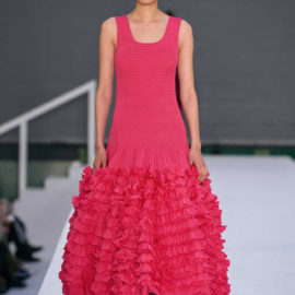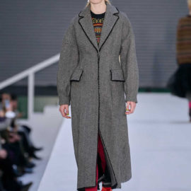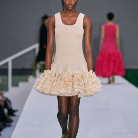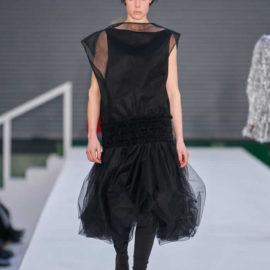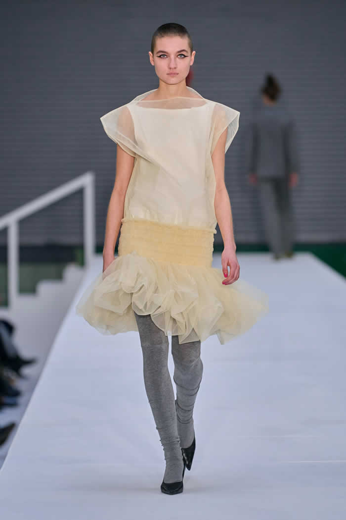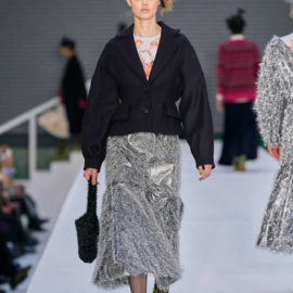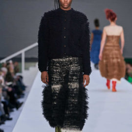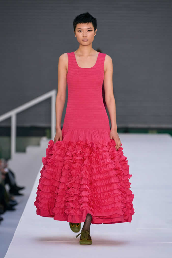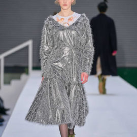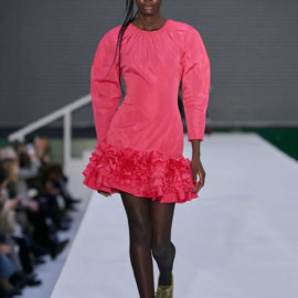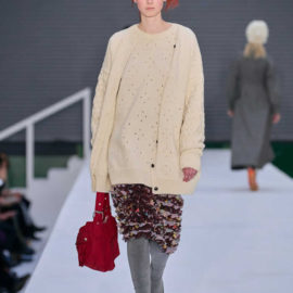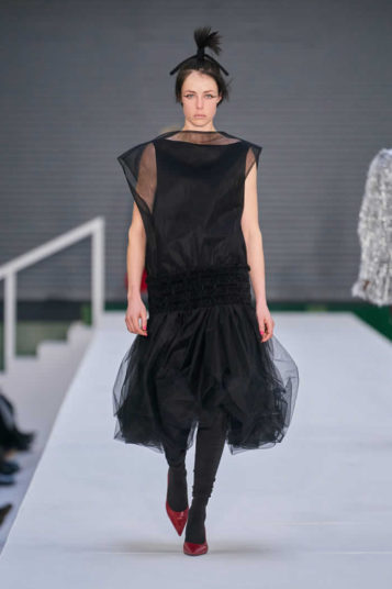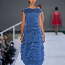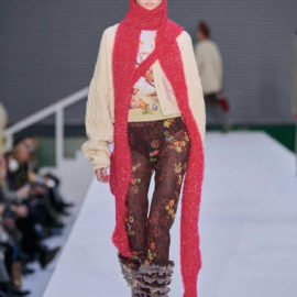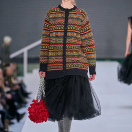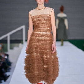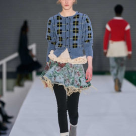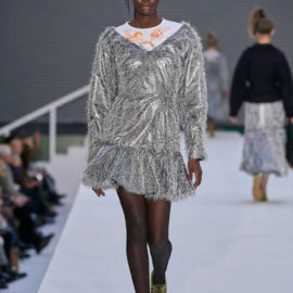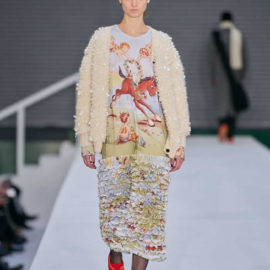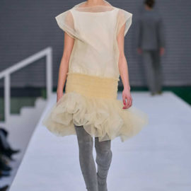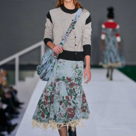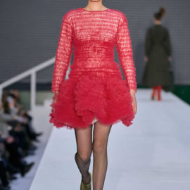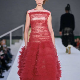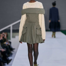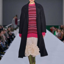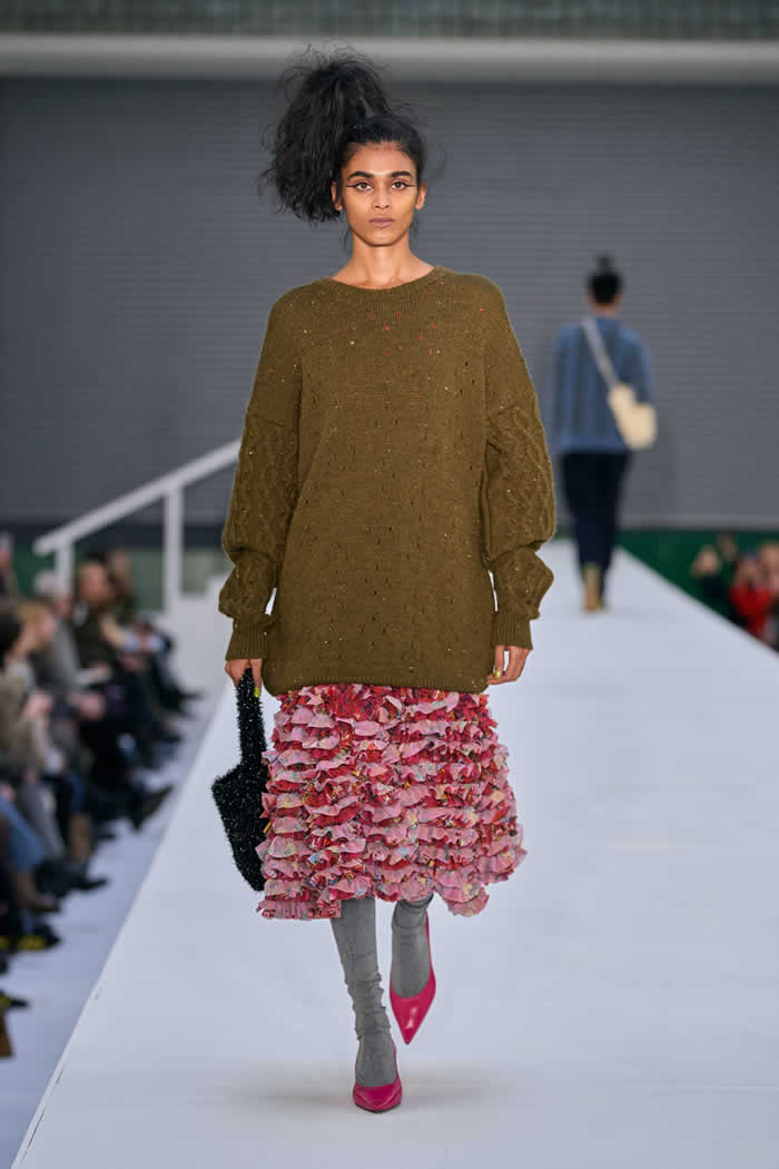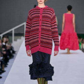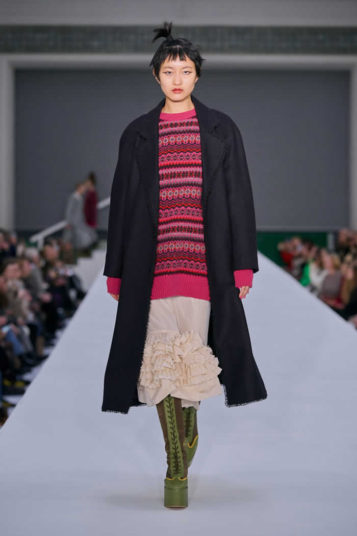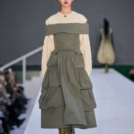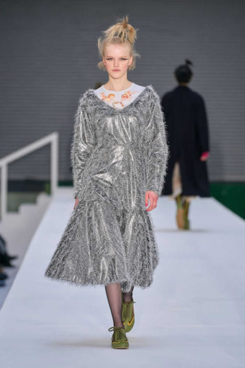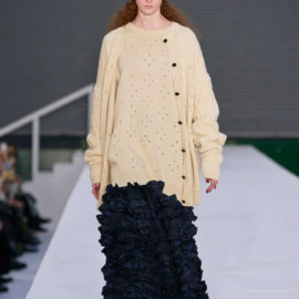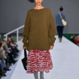 Which explained the re-manifestation of multi-ruffled net poodle skirts and swishy fishtail dresses, styled with contradictory oversized trad knitwear, big ’40s or ’50s coats, and the odd helping of tattered fabric that might have been converted from country house upholstery.