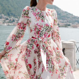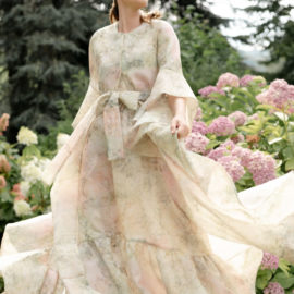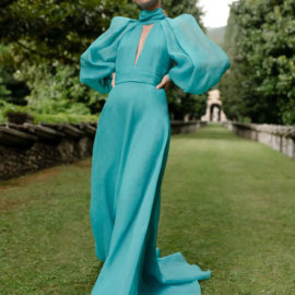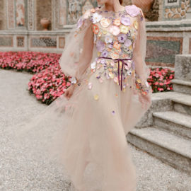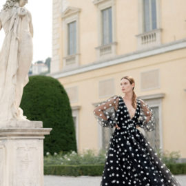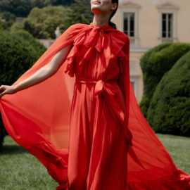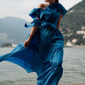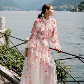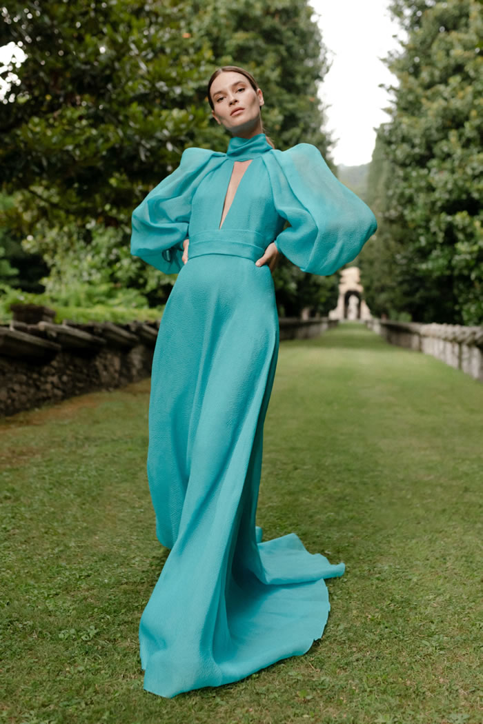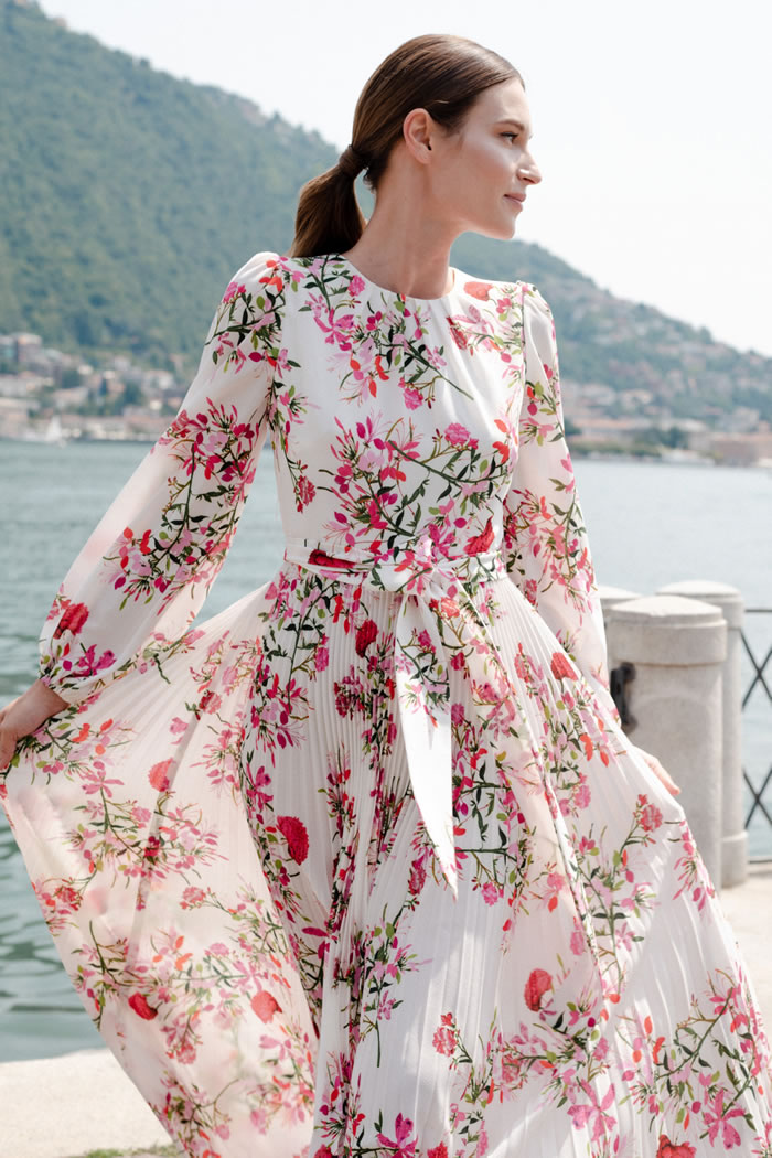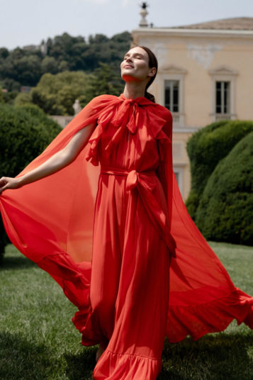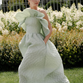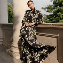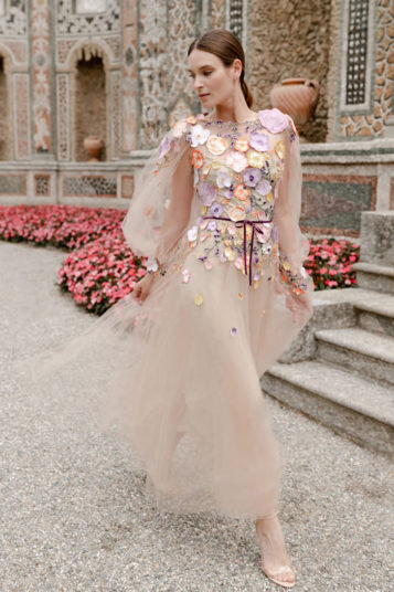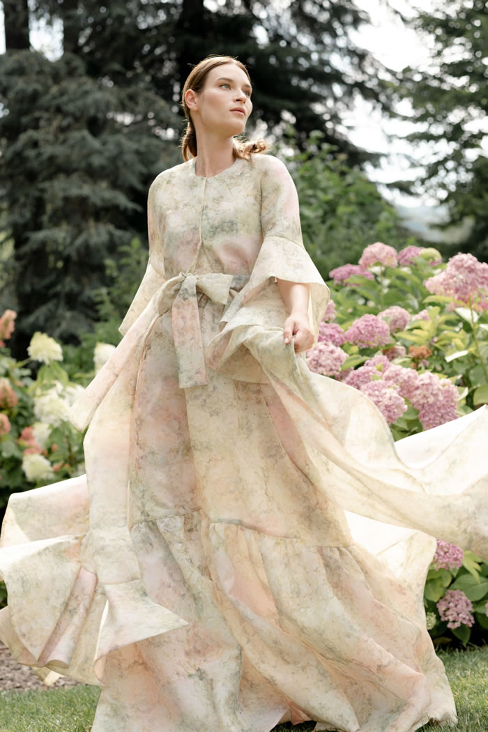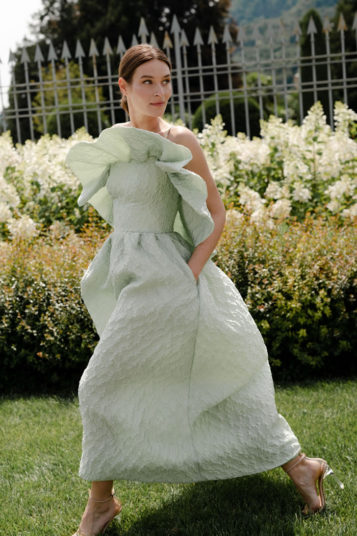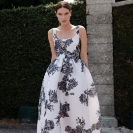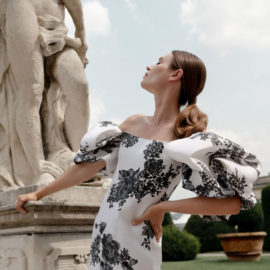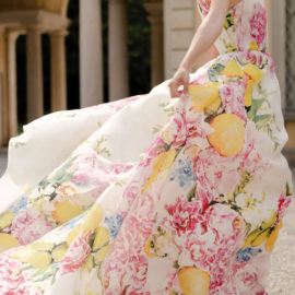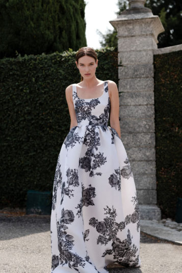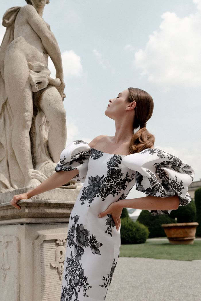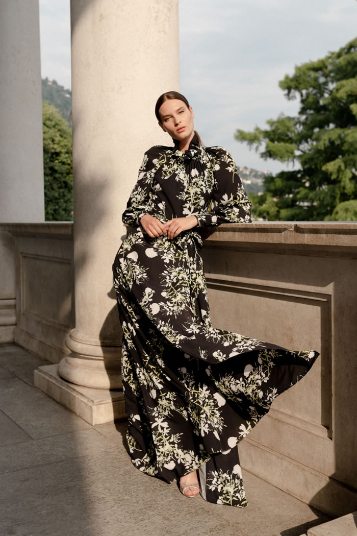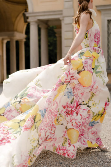 Infusing this collection is a buoyant feeling of optimism, emphasized through color, cut, and volume. Lhuillier photographed it in Italy once it was possible to travel again—note the lemon/floral print.