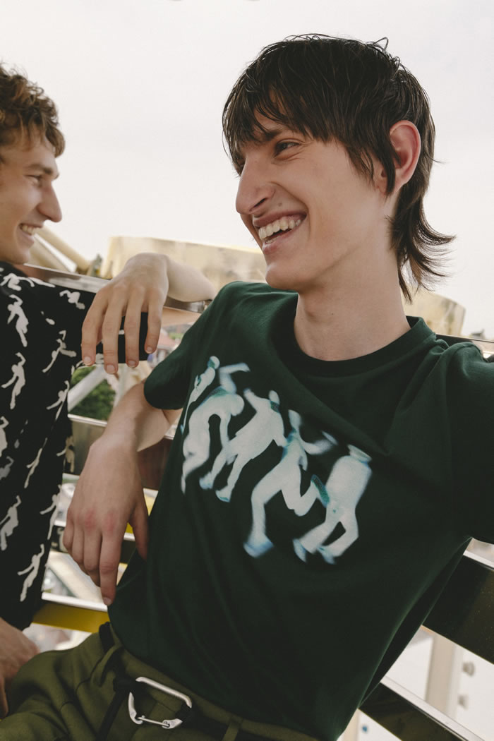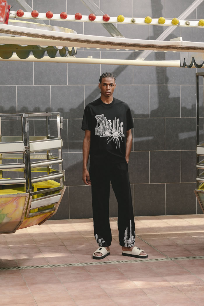Abstract renditions of flying dancers, cacti, and wild desert animals were jacquard-ed on sweats or printed on boxy, slightly rigid workwear-inspired shirts; gradients of military green and blue counterbalanced a hushed palette of beige, ivory, and black.