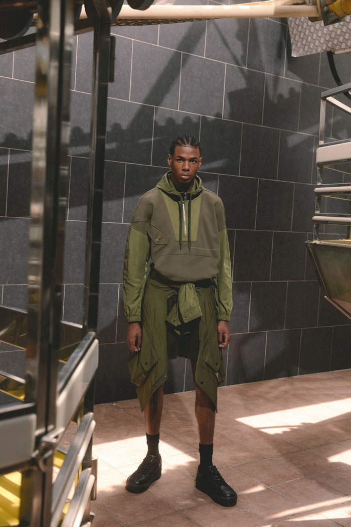 To enhance the sense of movement, construction was roomy, rounded, and comfortable, but lines were kept diagonal and ergonomic. Capacious utilitarian pockets were treated decoratively, cut slightly curved on an elongated military jacket, or patched irregularly on an oversized field jacket for a fresh take on a popular army surplus template.