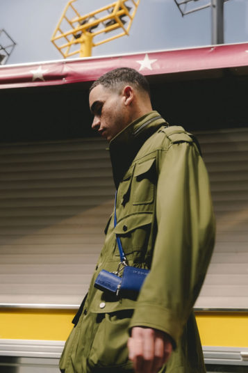 To enhance the sense of movement, construction was roomy, rounded, and comfortable, but lines were kept diagonal and ergonomic. Capacious utilitarian pockets were treated decoratively, cut slightly curved on an elongated military jacket, or patched irregularly on an oversized field jacket for a fresh take on a popular army surplus template.