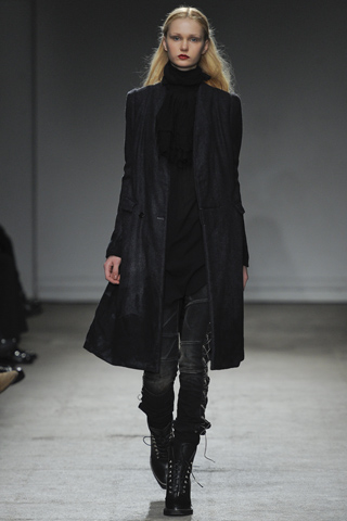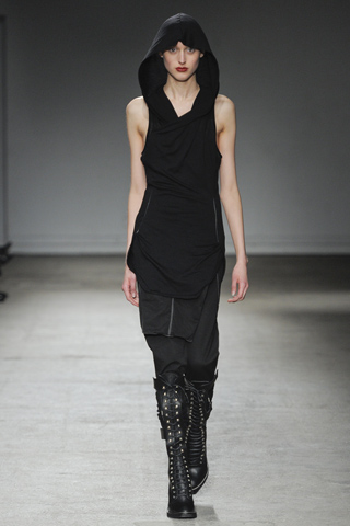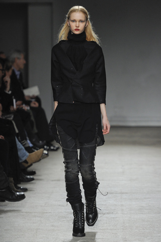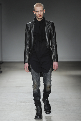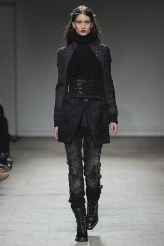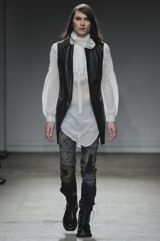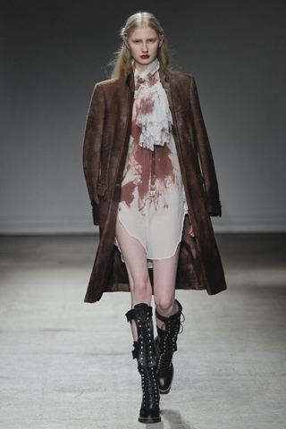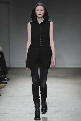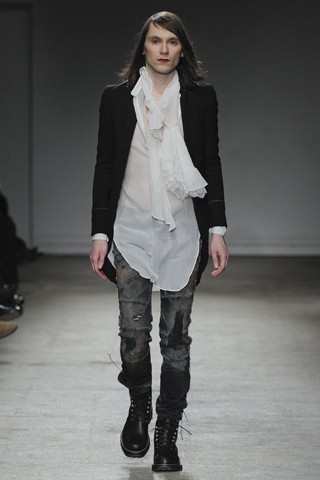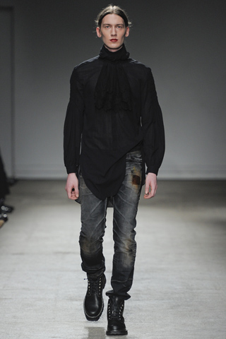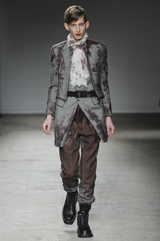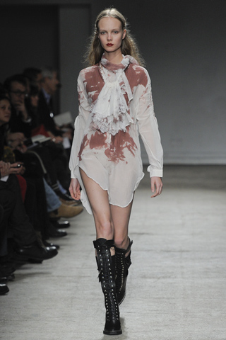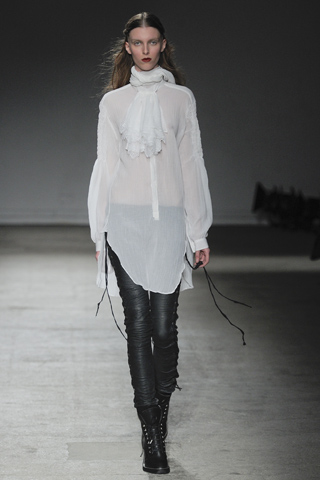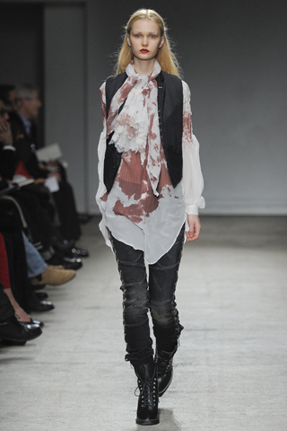 Nicolas Andreas Taralis fall ready-to-wear collection 2011 seemed to be inspired from ‘Twilight’ vampire drama with those dark and serious ensembles blended with cherry red lips and hoodies at some places, As the long skinny models strutted their way to the onlookers, they seemed to be taken from hoards of vampires in Twilight series. Moreover, the splashes of blood on white blouses, the hem of which extended halfway down the thighs, enhanced the ghastly effect that the latest fall collection 2011 produced. However, there was an added romance of Victorian frills and sheer white sensuality in the fall ready-to-wear collection 2011 by Taralis, which was made more edgy and masculine with faded leather pants and heavy duty boots. Nicolas Andreas Taralis Ready to wear 2011 collection presented at Paris Fashion Week Ready to wear 2011-2012 for new fashion.