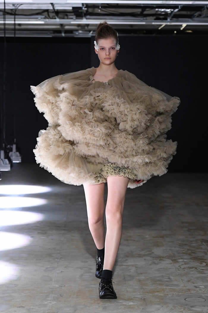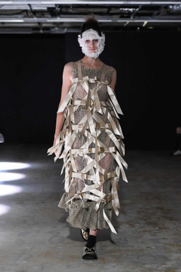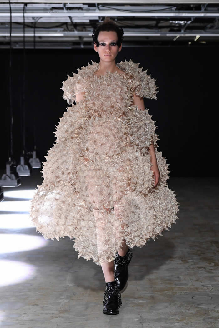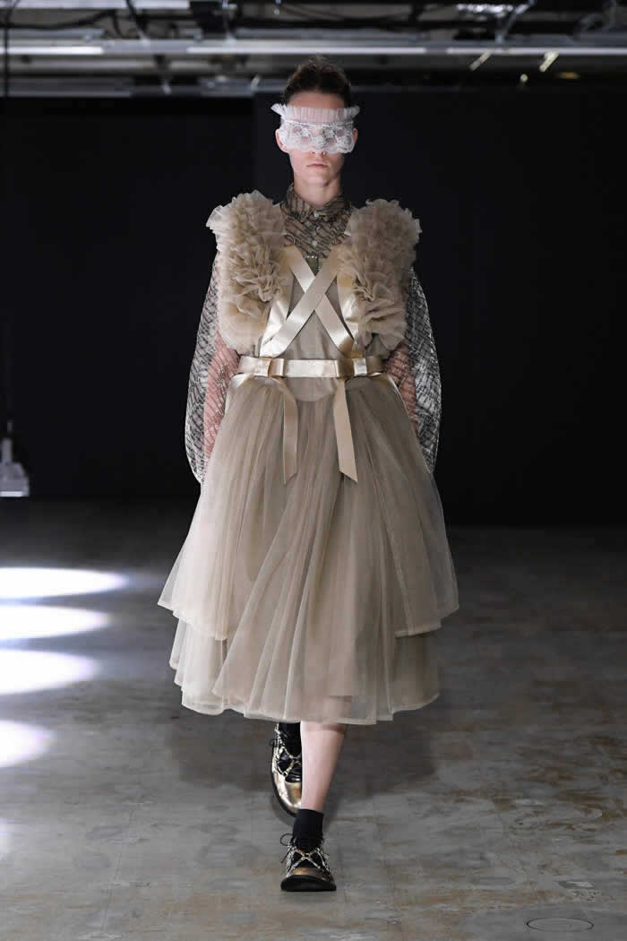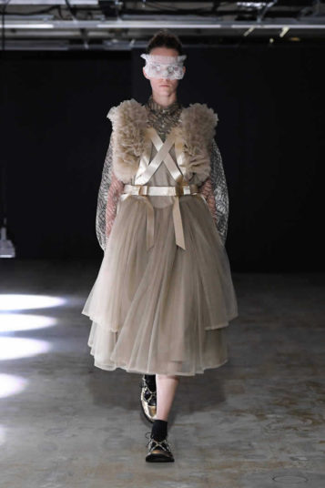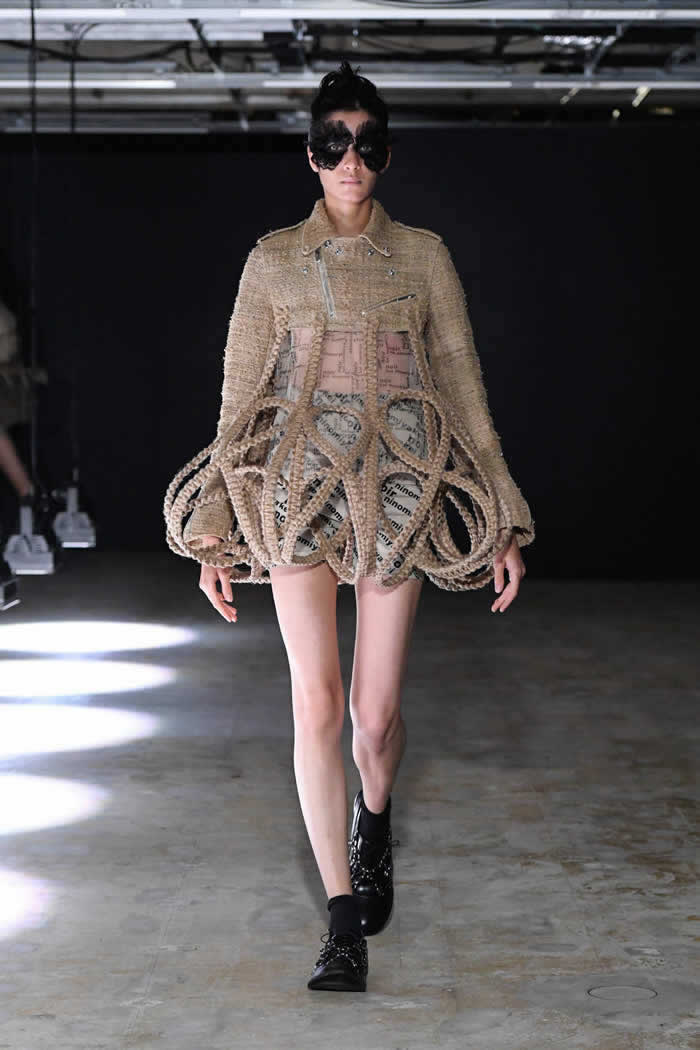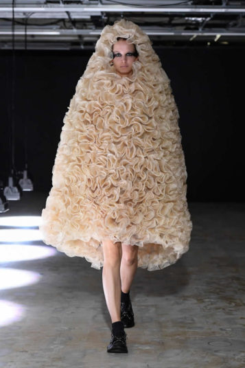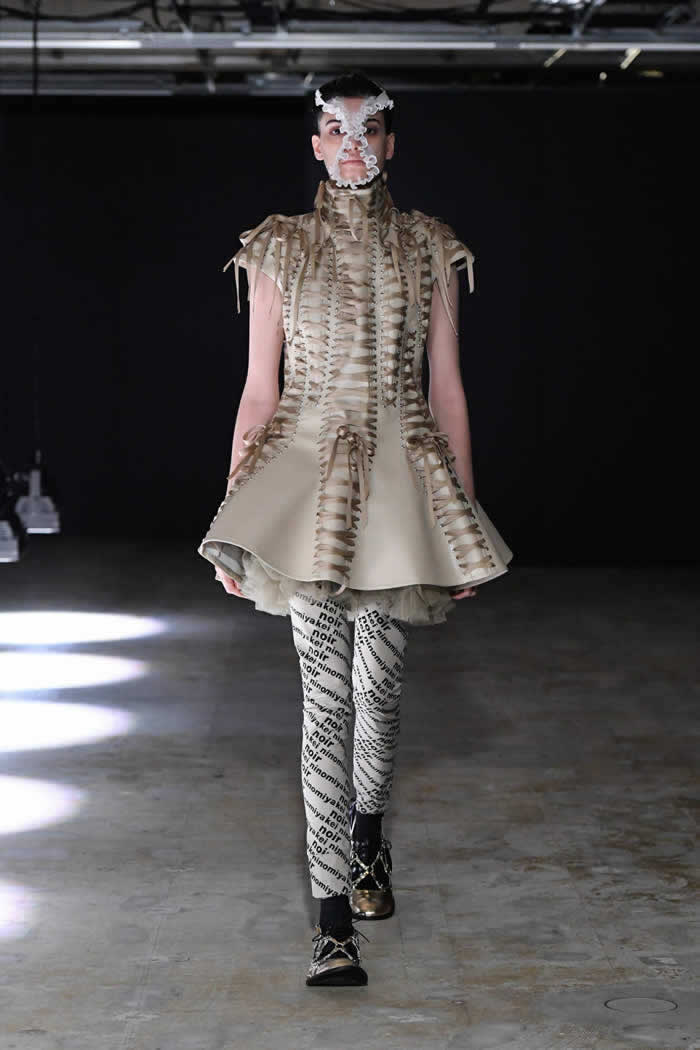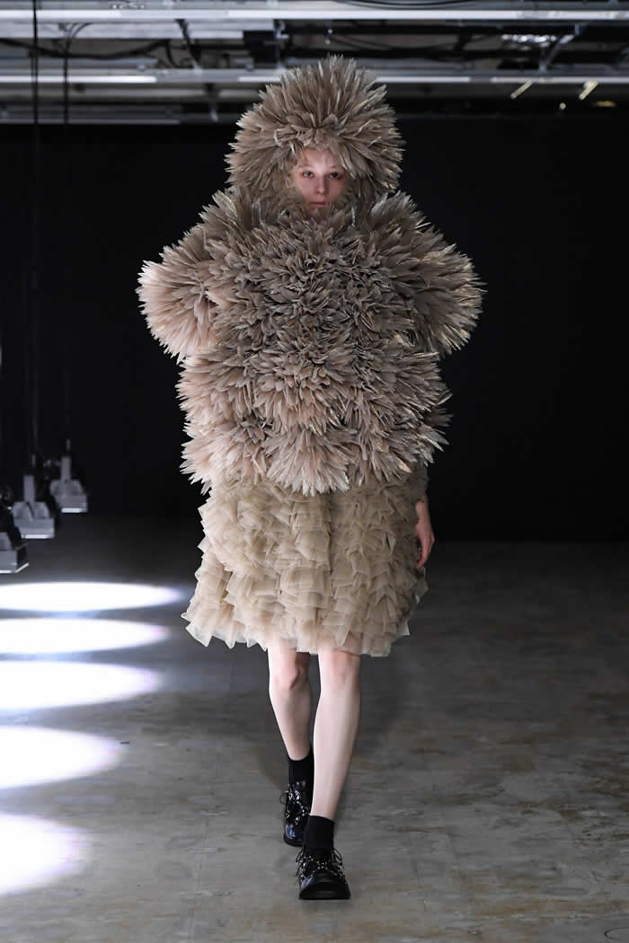 Ninomiya has experimented with non-Noir color previously, most often via brilliant botanical worn installations that were absent today. Instead, he expressed his notion of black shadow by creating a series of pieces in beige.