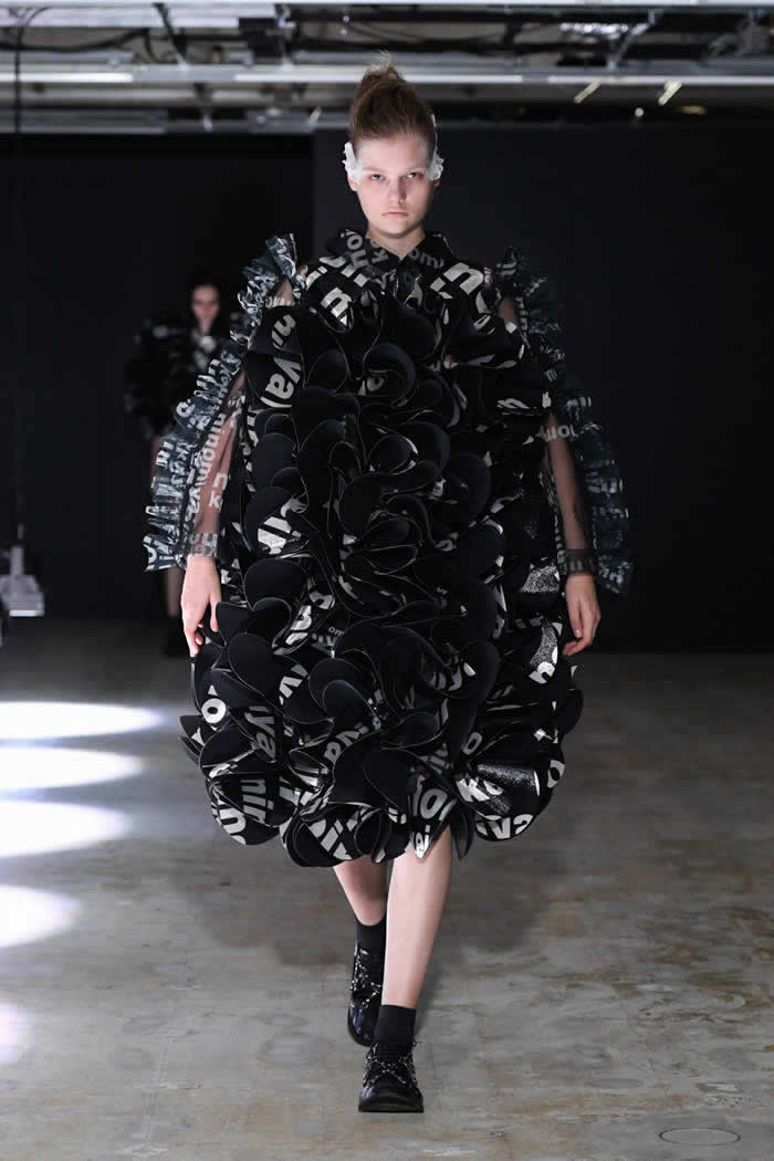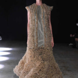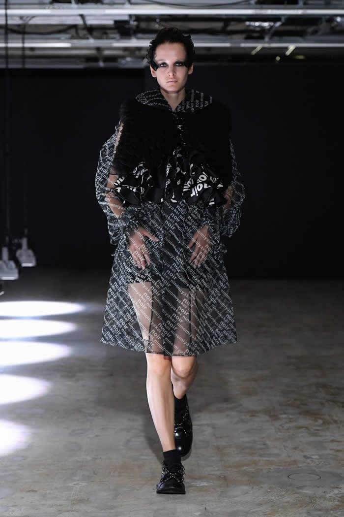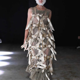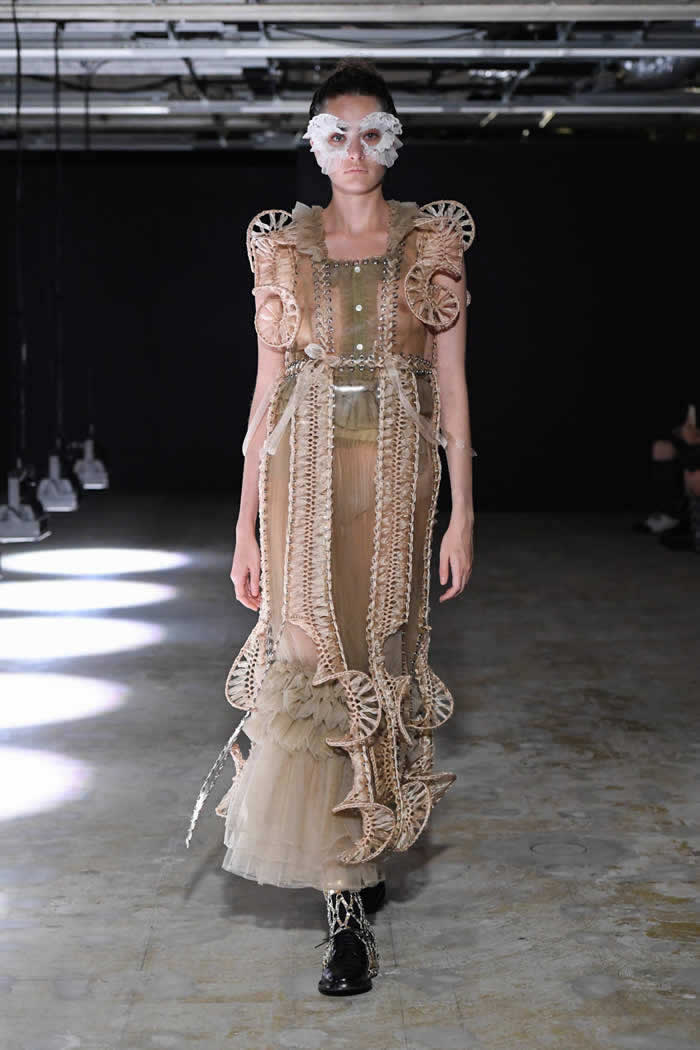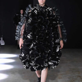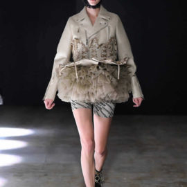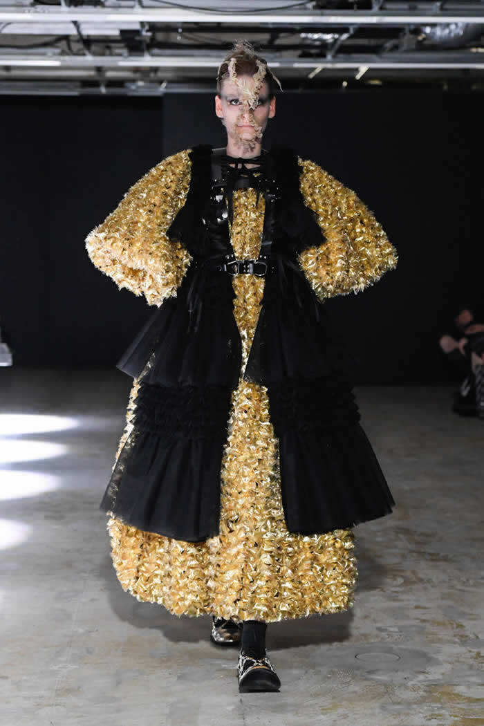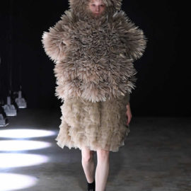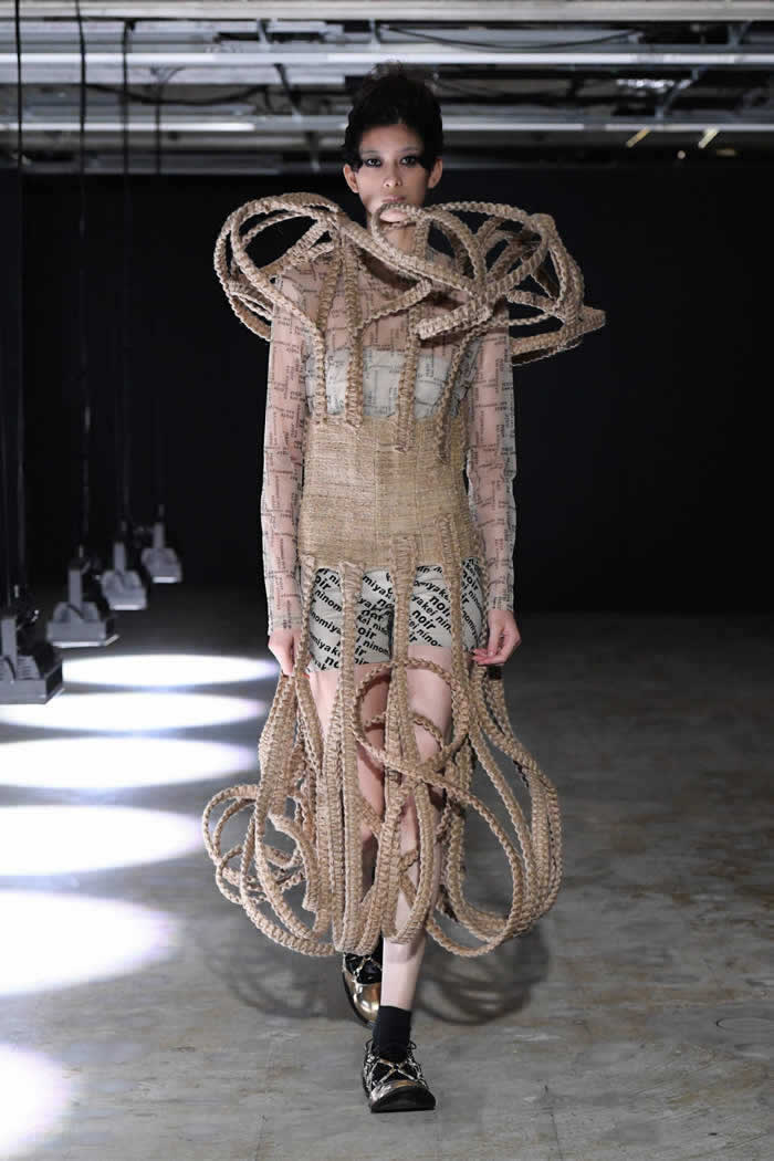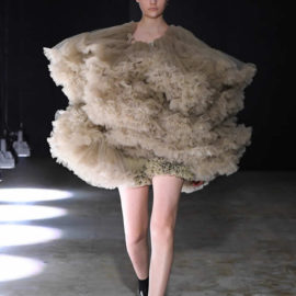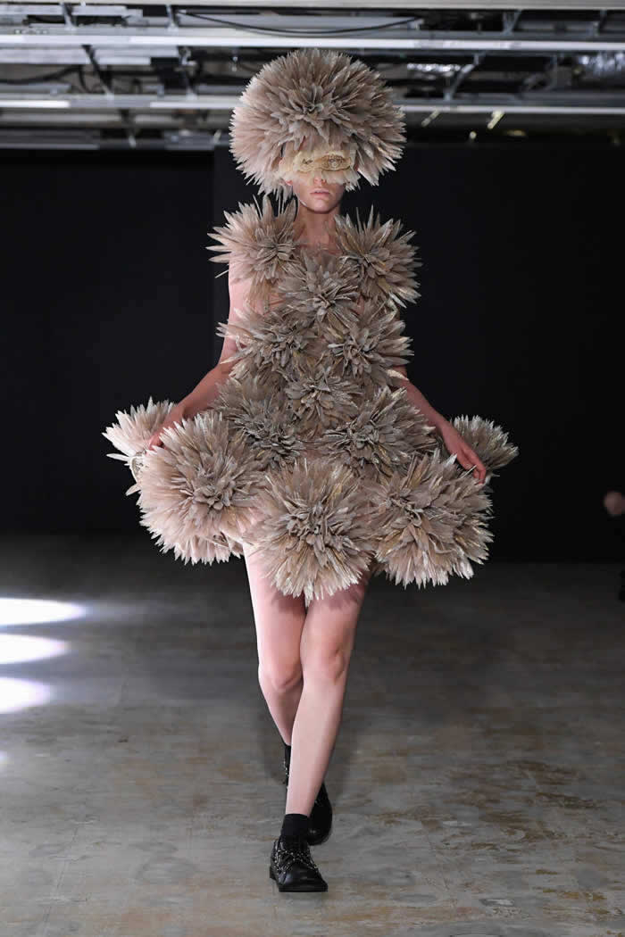 Ninomiya has experimented with non-Noir color previously, most often via brilliant botanical worn installations that were absent today. Instead, he expressed his notion of black shadow by creating a series of pieces in beige.