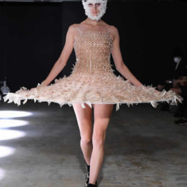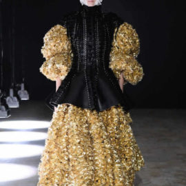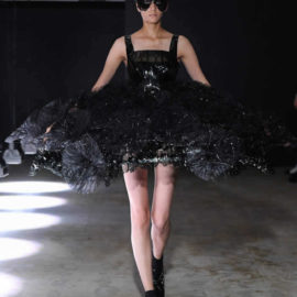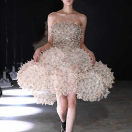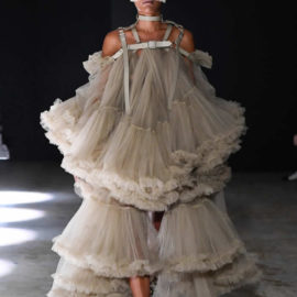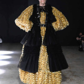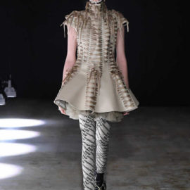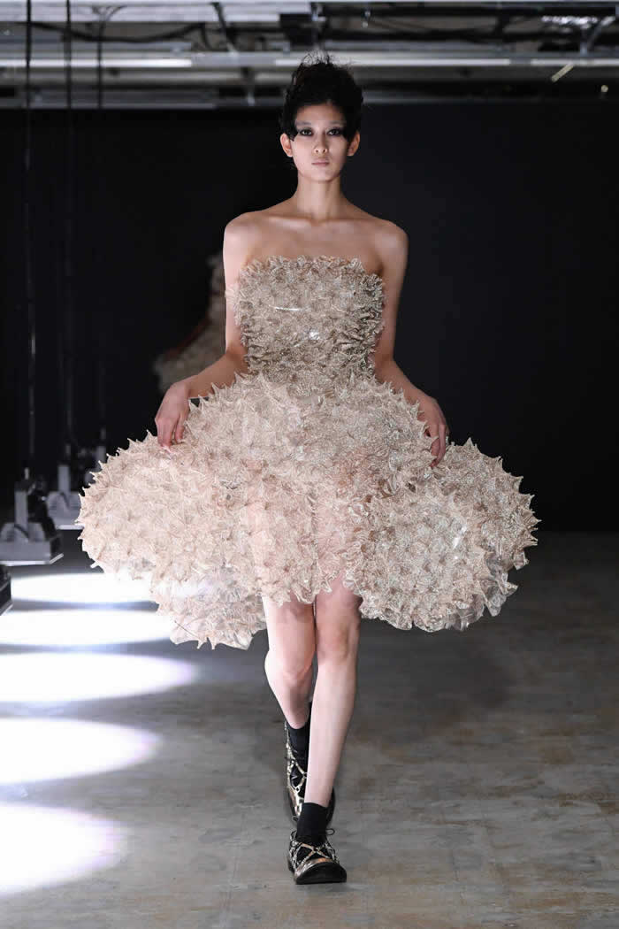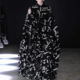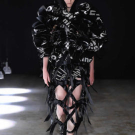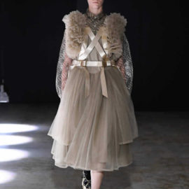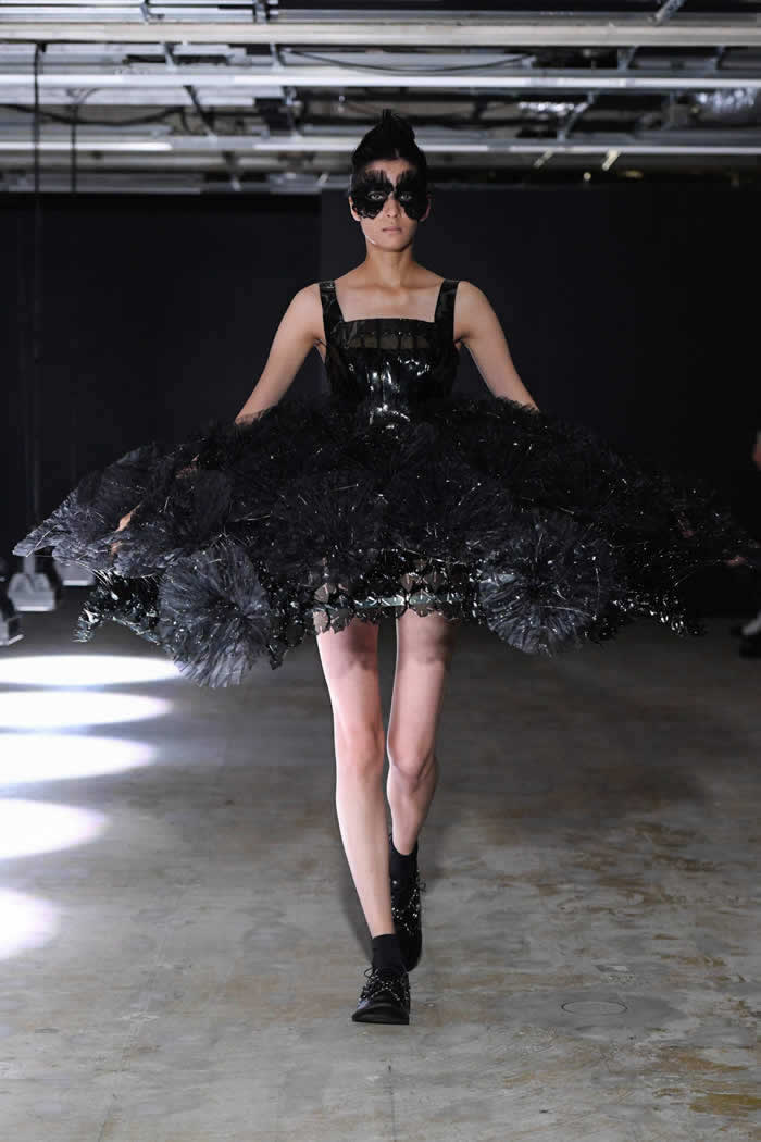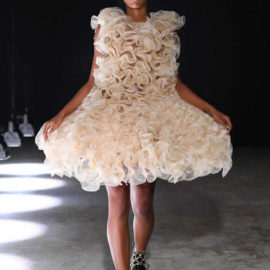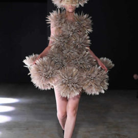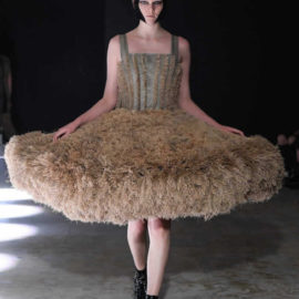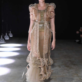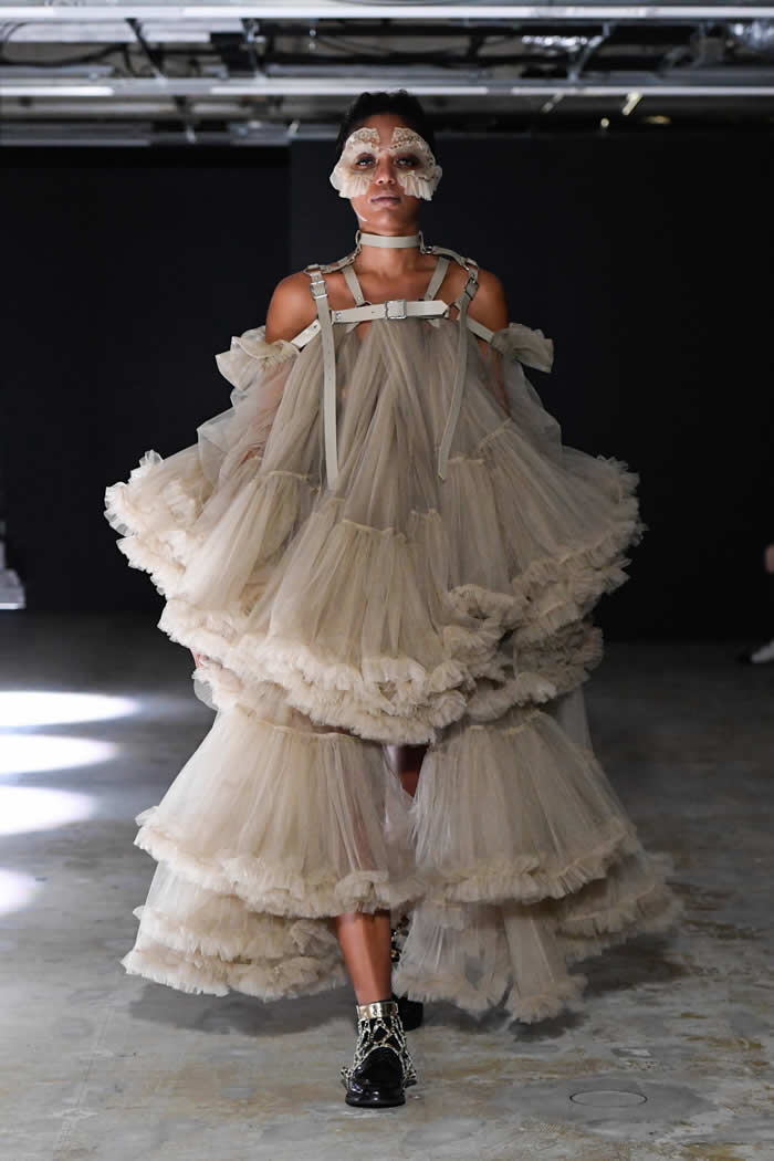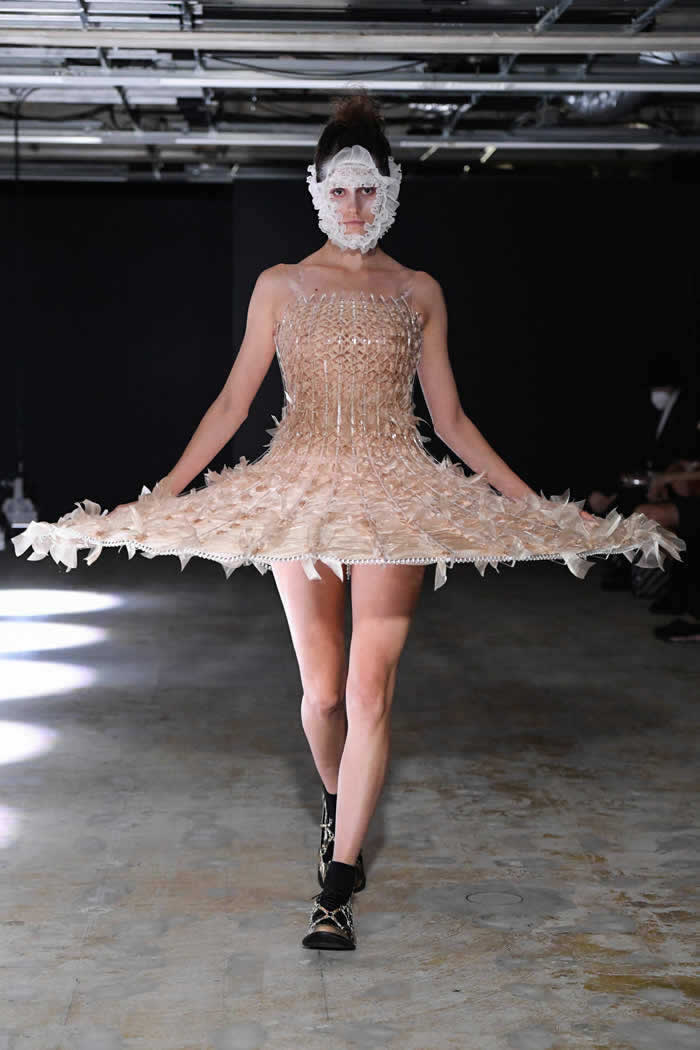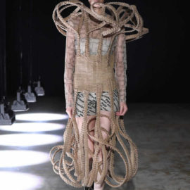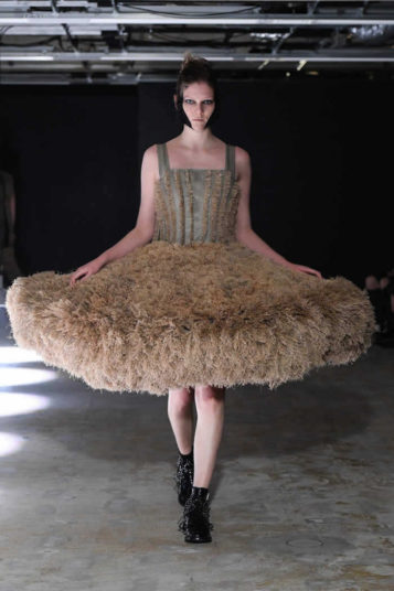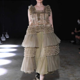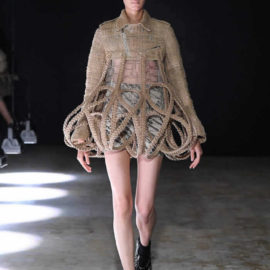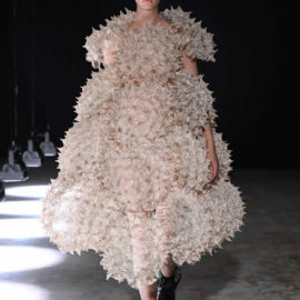 Ninomiya has experimented with non-Noir color previously, most often via brilliant botanical worn installations that were absent today. Instead, he expressed his notion of black shadow by creating a series of pieces in beige.