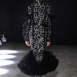 The name of the brand was used to make rough white-on-black stripes and checks, which was fine enough on pants, shirts, and cycling shorts. When applied to a more sculptural piece, however, such as Look 9, this branding felt pretty extraneous; for who else could that dress be by but Ninomiya?