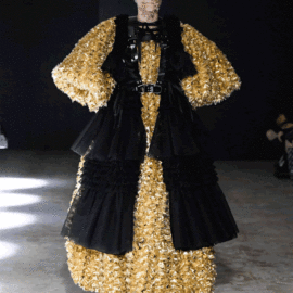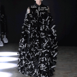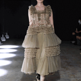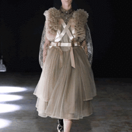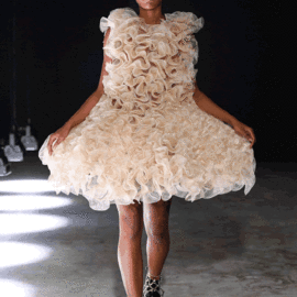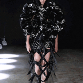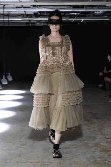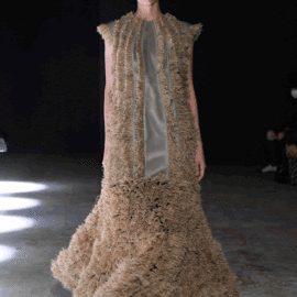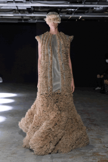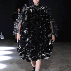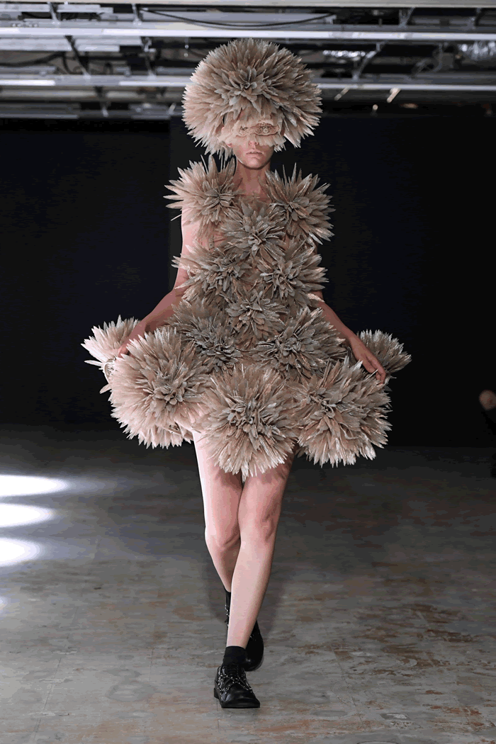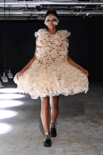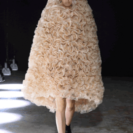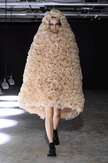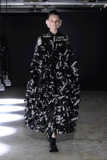 Ninomiya has experimented with non-Noir color previously, most often via brilliant botanical worn installations that were absent today. Instead he expressed his notion of black’s shadow by creating a series of pieces in beige.