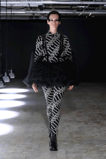 The name of the brand was used to make rough white-on-black stripes and checks, which was fine enough on pants, shirts, and cycling shorts. When applied to a more sculptural piece, however, such as Look 9, this branding felt pretty extraneous; for who else could that dress be by but Ninomiya?