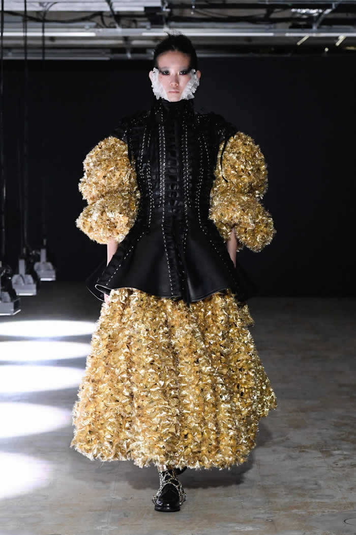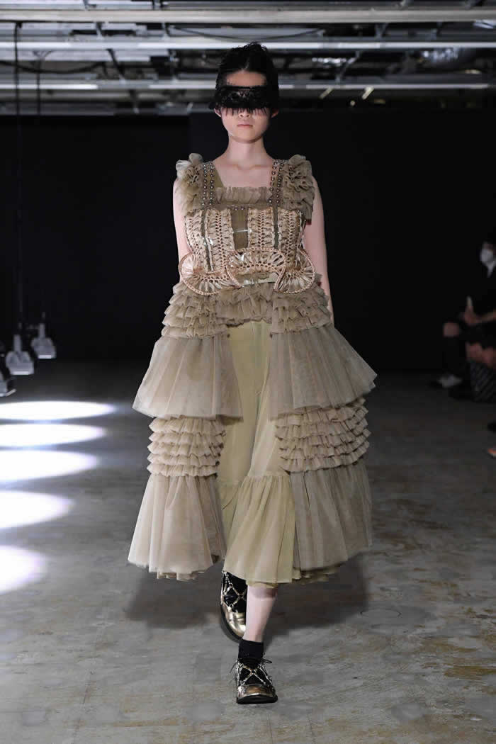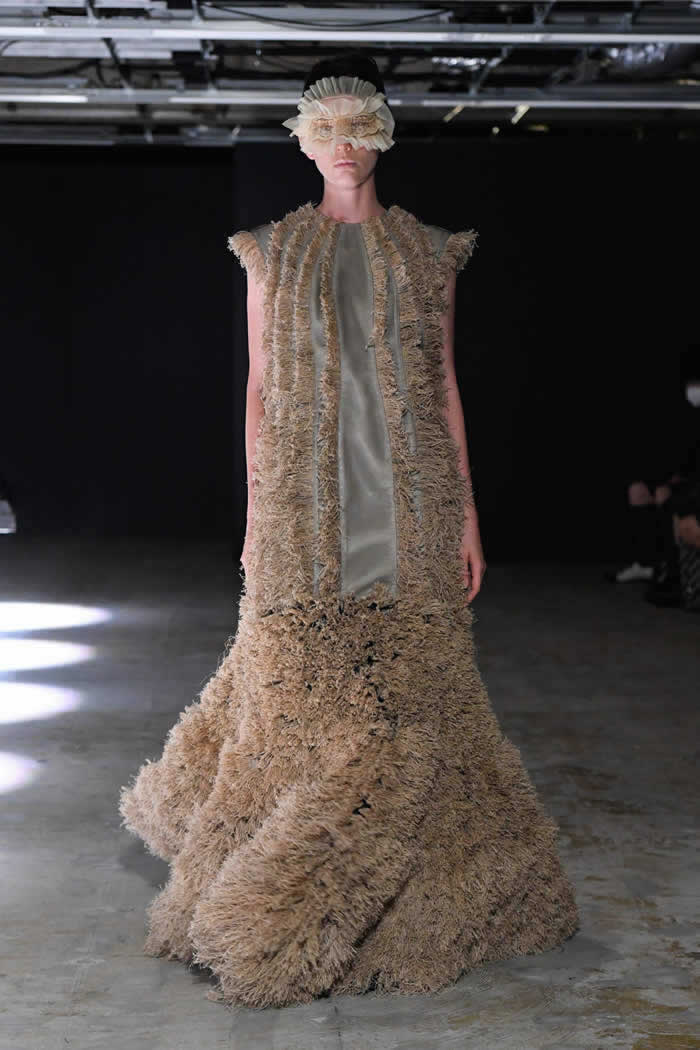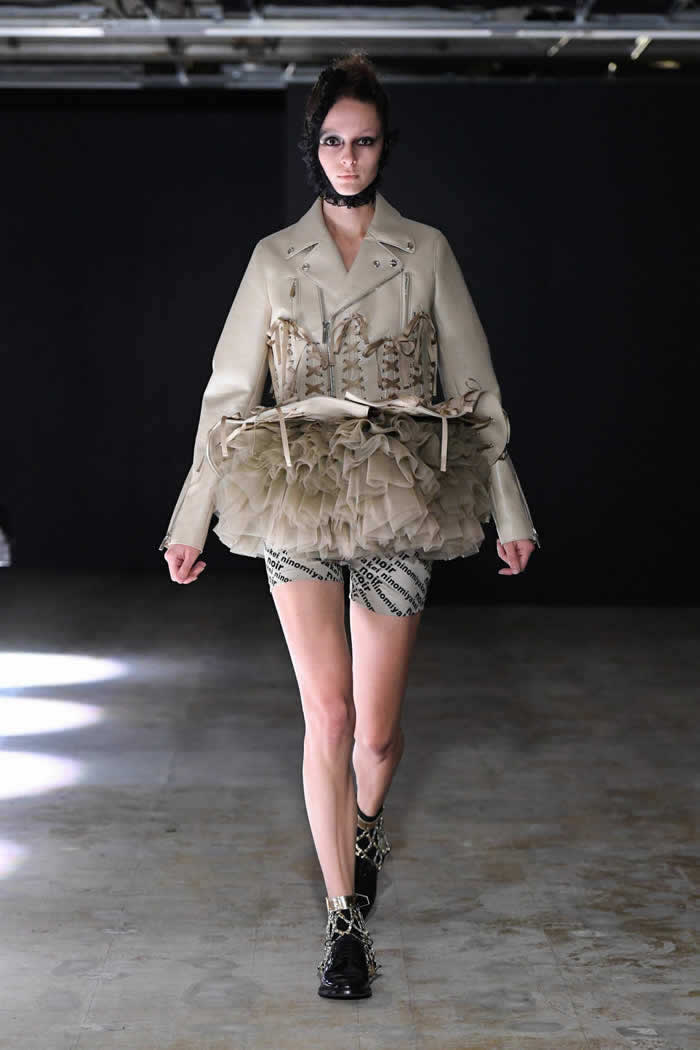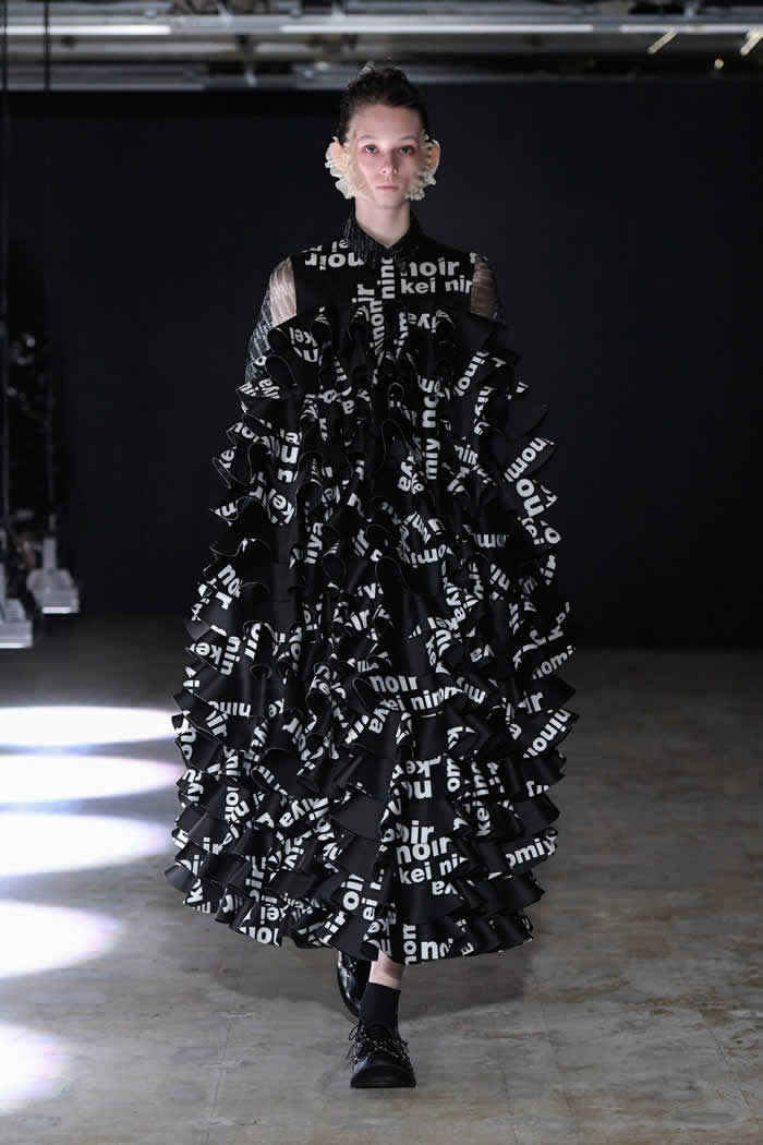 Ninomiya has experimented with non-Noir color previously, most often via brilliant botanical worn installations that were absent today. Instead, he expressed his notion of black shadow by creating a series of pieces in beige.