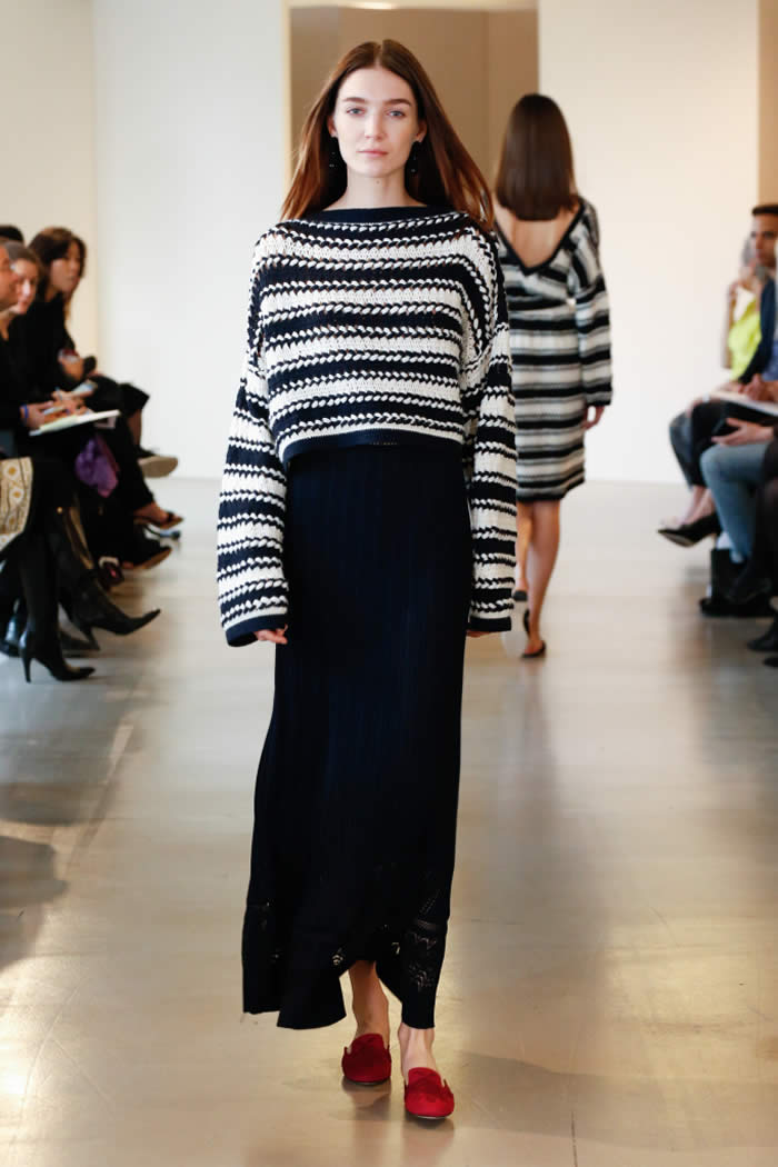 During a presentation, chief executive officer Alex Bolen noted that in a recent chat with an industry veteran, the person observed that people don’t dress up anymore. “I disagree,” Bolen said. “I think we have to give them ways to dress up that make sense for the way we live today.” Given that premise, the inspiration chosen to mine seemed a tad curious: “Alta Moda,” Mario Testino’s 2014 photo exhibition of people in traditional Peruvian dress (a show Oscar de la Renta brought to the Queen Sofia Institute during his term as its chairman). Two of those photos included in a pre-fall press kit presaged what might have been a costume-y collection. Instead, the design studio invoked the theme with smart discretion, delivering some lovely clothes. The designers focused on long, manageably full skirts paired to small tops and shirts, often with bell sleeves, and on inviting patterned knitwear. They worked in a colorful but earthy palette that makes sense for that transitional summer period which, increasingly, brands are addressing in pre-fall.